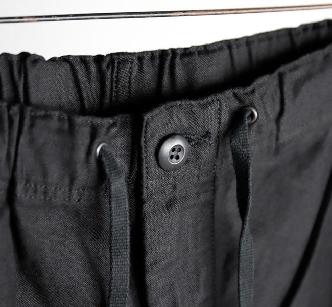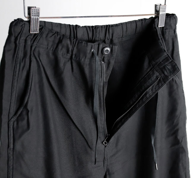 ワイドシルエットと相性の良い、ライトウェイトでとても柔らかいリバースサテンを使用。ウエスト部分はゴム入りのシャーリング仕様。