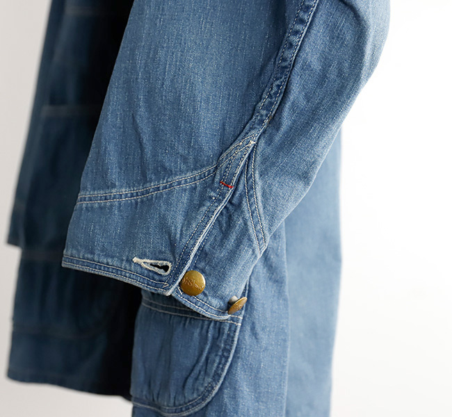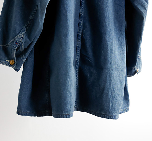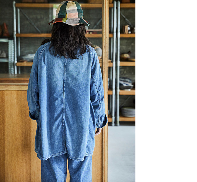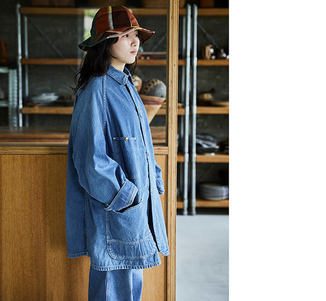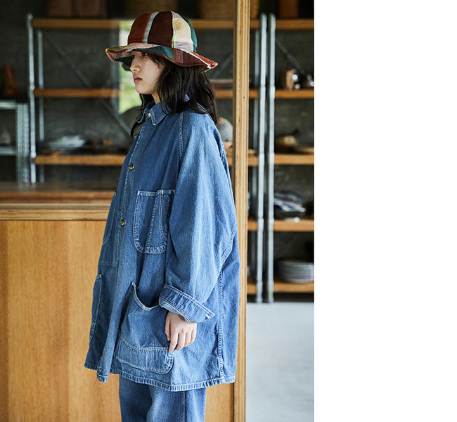 こちらはUSED加工バージョン。機能的なフロントポケットや随所に無骨なディテールをそのままに、女性が着やすいように3本針は2本針に、ルーズシルエットなサイズ感でAラインにデザインされています。
