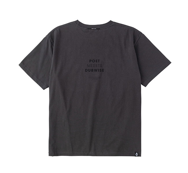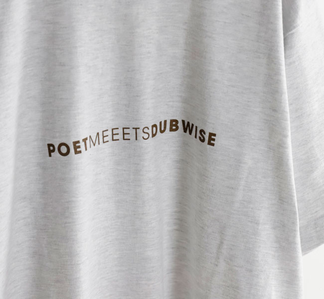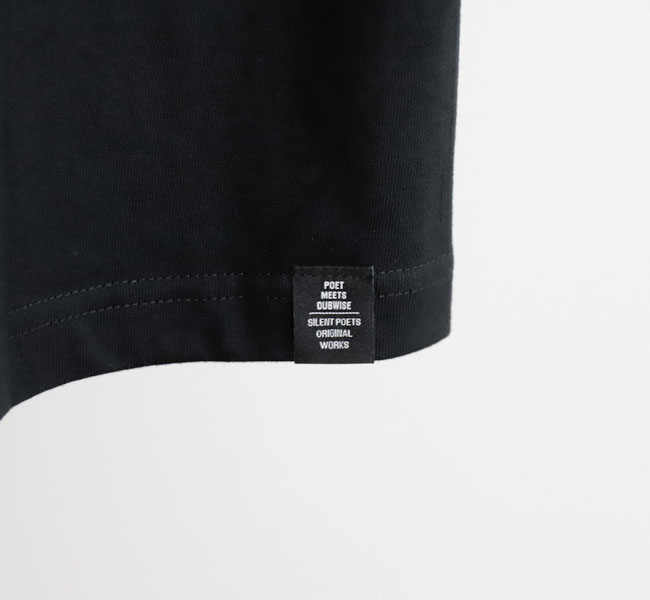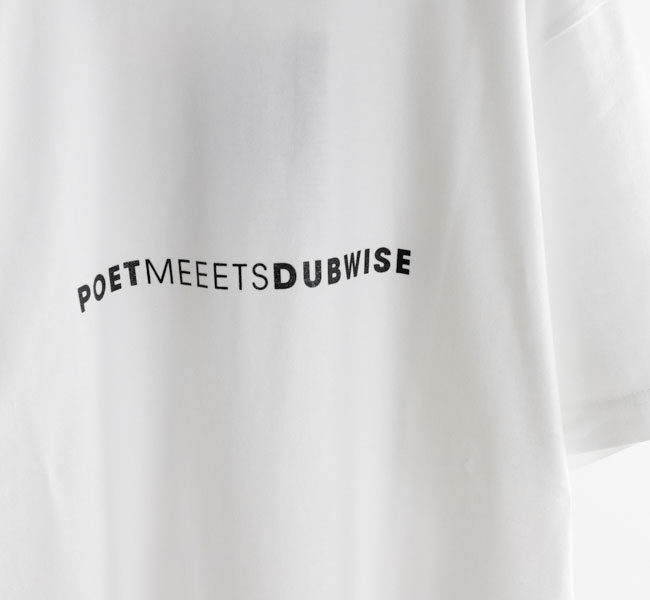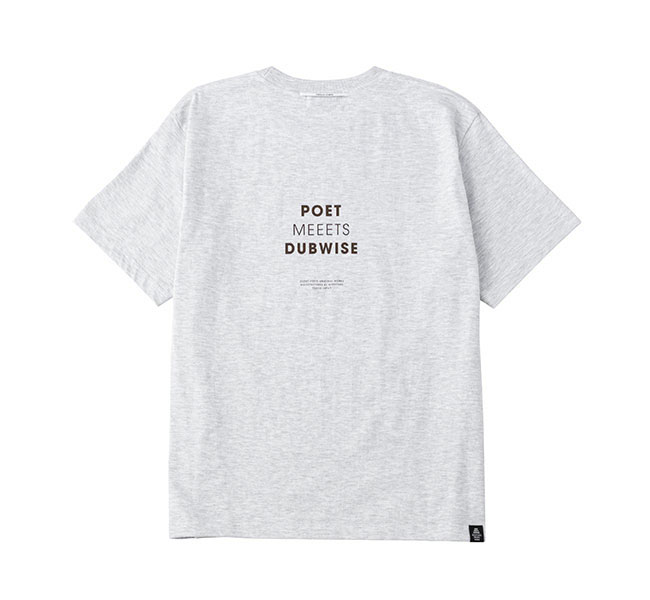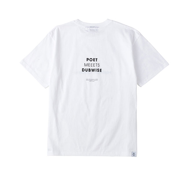 メランコリックでエモーショナルなDUB サウンドを表現するSILENT POETS こと下田法晴によるオリジナルブランド。 1990 年代からDJ/ ミュージシャンとして活動してきた下田はグラフィックデザイナーとしてのキャリアも長きにわたる。 自身の作品のアートワークやマーチャンダイズを手がける傍ら、これまでに数多くのブランドのグラフィックやロゴマークをデザインし、ファッションと音楽カルチャーに横断的にコミットしてきた。 POET MEETS DUBWISE は音楽とデザイン、そしてカルチャーが常に隣り合わせにある下田のキャリアそのものが表されたプロジェクトだ。 機能美や着心地を必要最小限にとどめたベーシックなアイテムには、SILENT POETS から連想されるキーワードや曲名をタイポグラフィとしてデザイン。 言葉の造形としての美しさと余白を意識したシンプルながら深度のあるプロダクト、その一つひとつに下田が一貫としてきた「自身の作品は音楽からアートワークまでを含めたトータルワーク」というスタンスが落とし込まれている。 感覚的に染み付いたコラージュやグラフィックデザイン的アプローチに基づくプロダクトは流行に左右されない表現だ。 目まぐるしく変化するファッショントレンドとは無縁な位置から、独自のスタンダードを提案していく。