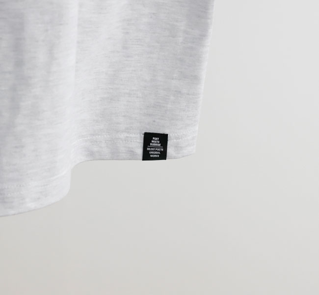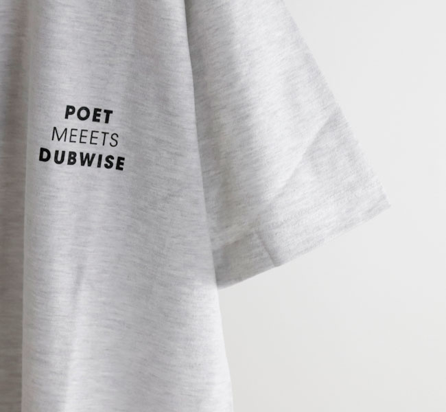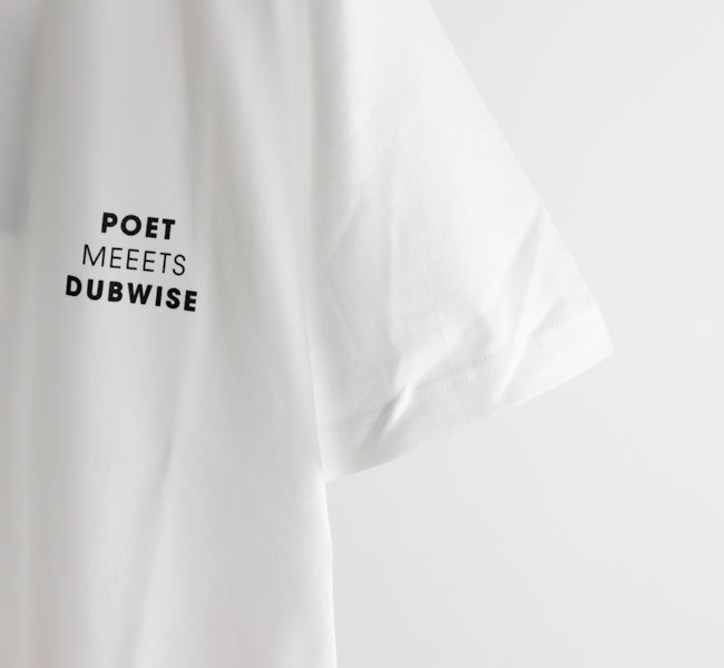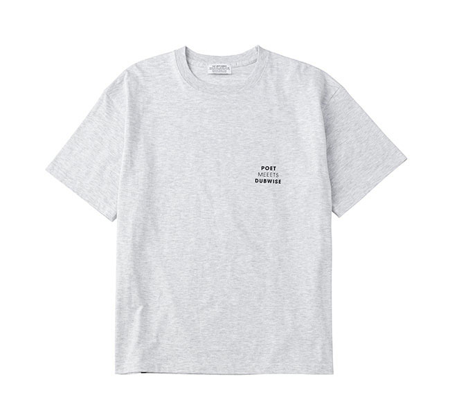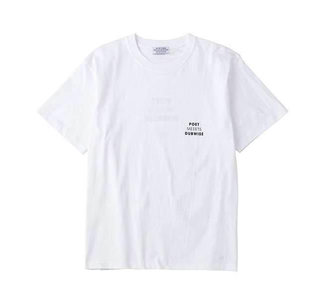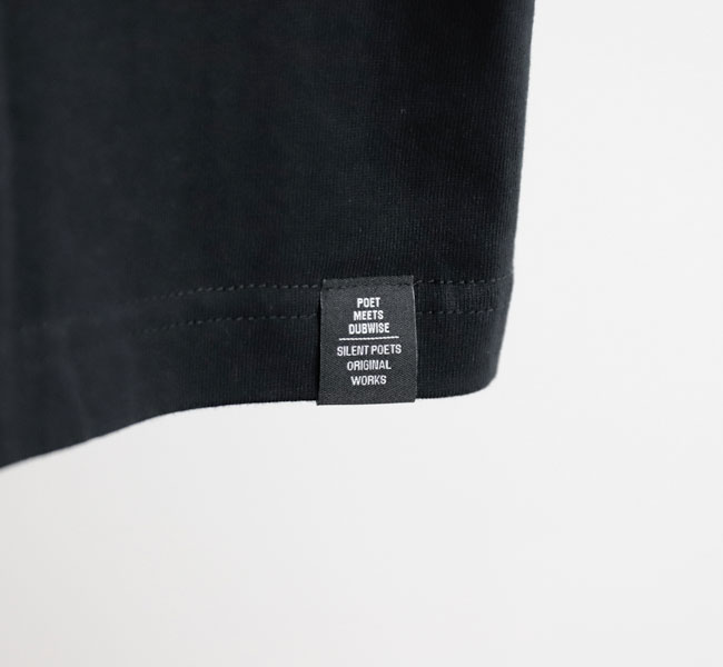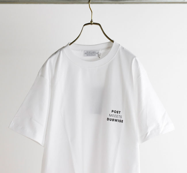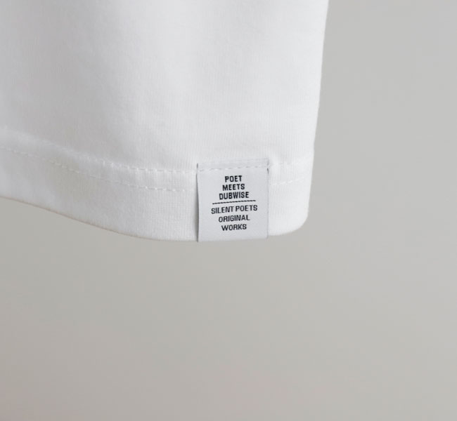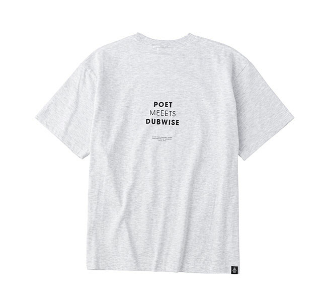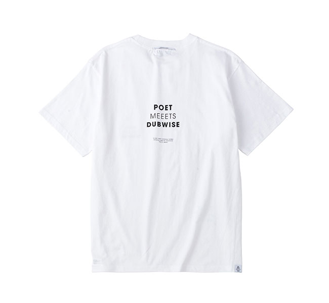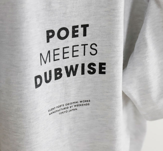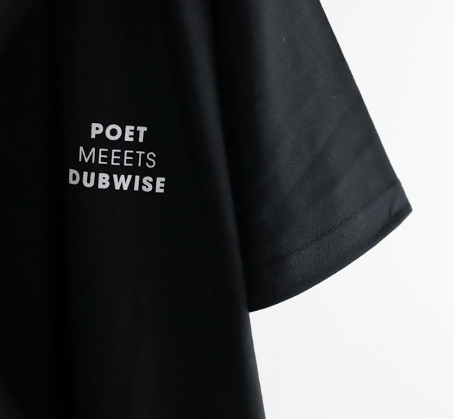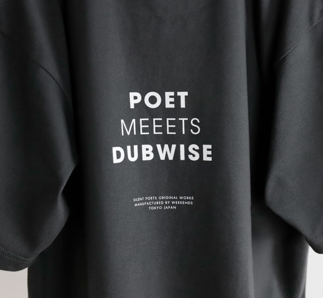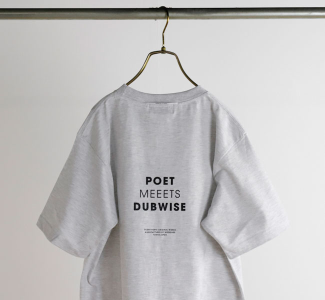 メランコリックでエモーショナルなDUB サウンドを表現するSILENT POETS こと下田法晴によるオリジナルブランド。 1990 年代からDJ/ ミュージシャンとして活動してきた下田はグラフィックデザイナーとしてのキャリアも長きにわたる。 自身の作品のアートワークやマーチャンダイズを手がける傍ら、これまでに数多くのブランドのグラフィックやロゴマークをデザインし、ファッションと音楽カルチャーに横断的にコミットしてきた。 POET MEETS DUBWISE は音楽とデザイン、そしてカルチャーが常に隣り合わせにある下田のキャリアそのものが表されたプロジェクトだ。 機能美や着心地を必要最小限にとどめたベーシックなアイテムには、SILENT POETS から連想されるキーワードや曲名をタイポグラフィとしてデザイン。 言葉の造形としての美しさと余白を意識したシンプルながら深度のあるプロダクト、その一つひとつに下田が一貫としてきた「自身の作品は音楽からアートワークまでを含めたトータルワーク」というスタンスが落とし込まれている。 感覚的に染み付いたコラージュやグラフィックデザイン的アプローチに基づくプロダクトは流行に左右されない表現だ。 目まぐるしく変化するファッショントレンドとは無縁な位置から、独自のスタンダードを提案していく。