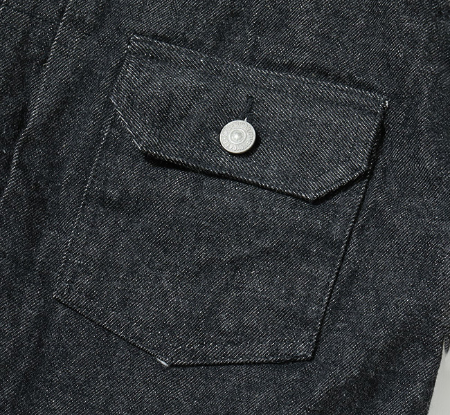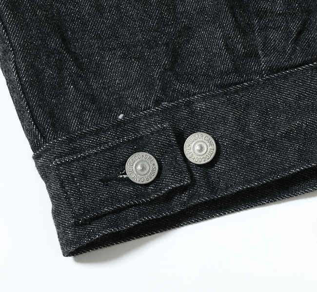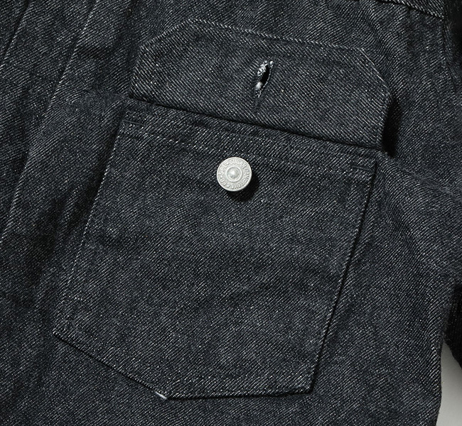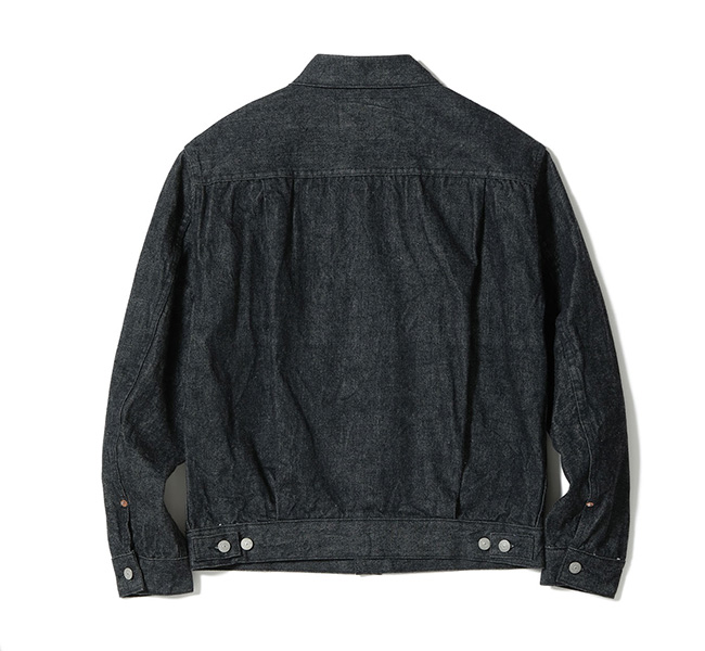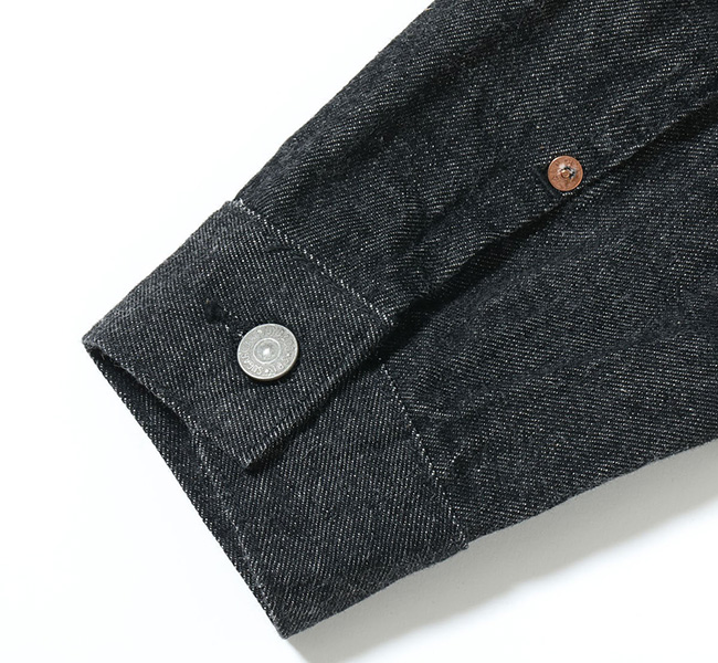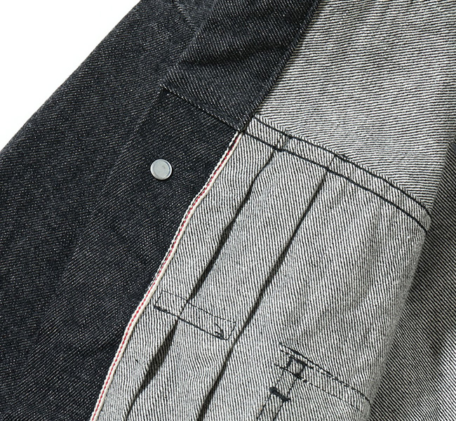 1950年代を代表するその名作を経糸に黒糸、緯糸に生成りの糸を使用したオリジナルのブラックデニムで仕立てた。タテ糸7番、ヨコ糸6番のムラ糸で織り上げた14.25オンスのセルビッジデニムであり、ミミは白×赤となっている。またブラックの染色には硫化染料を使用しており、着用による経年変化で深みのある色落ちを魅せる。