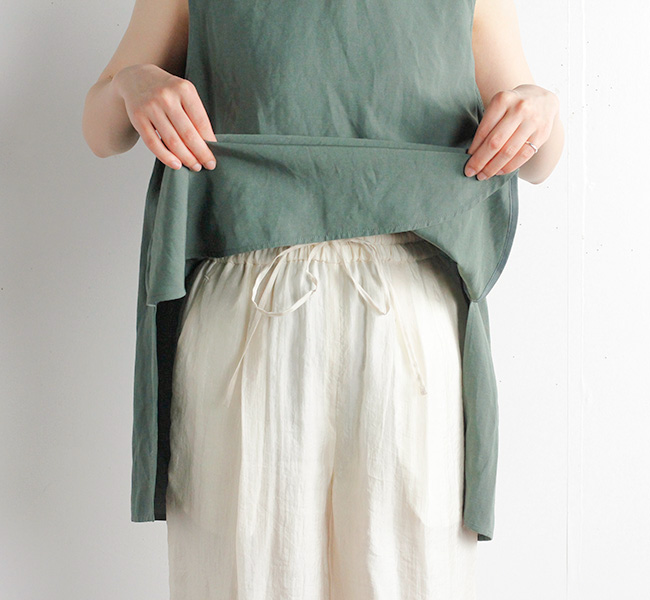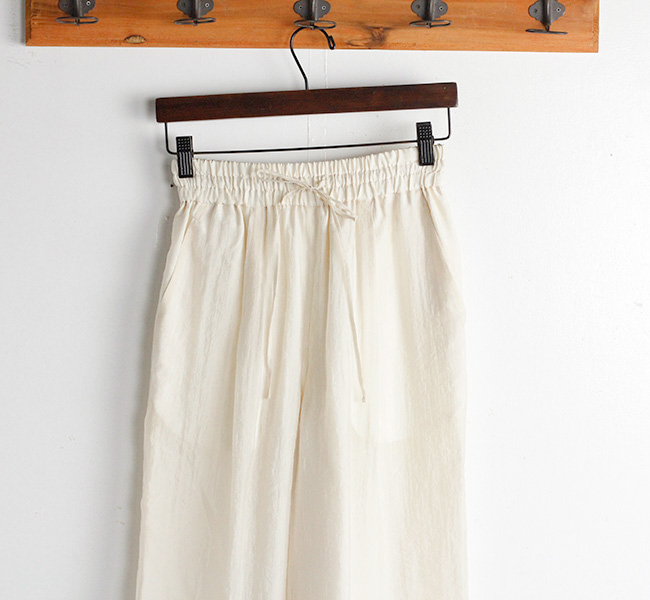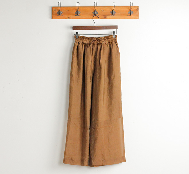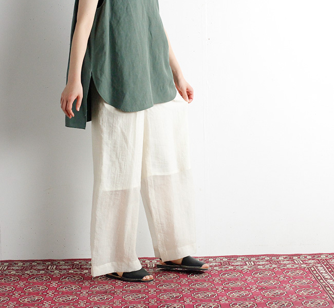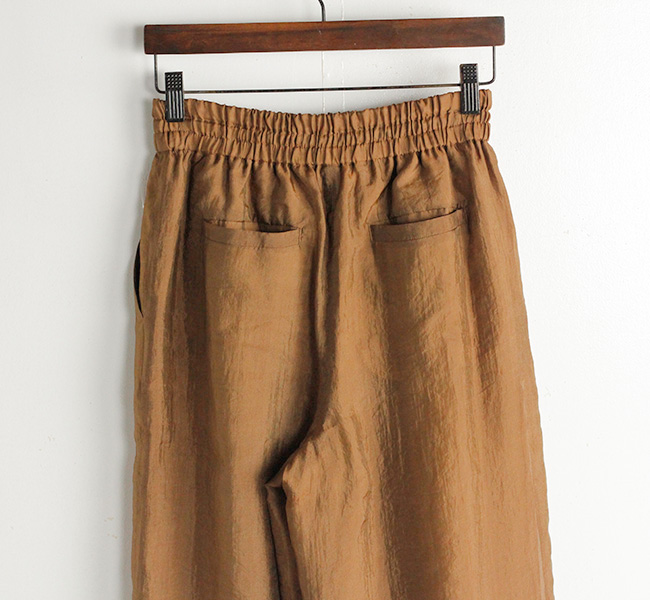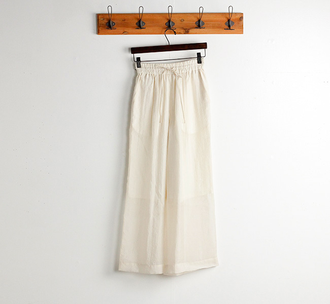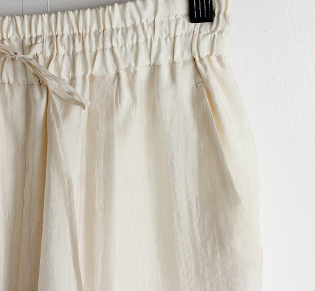 繊細で上質なシルクナイロンオーガンジー素材のシアーワイドパンツ。ワッシャー仕上げの独特な表情と光沢感から覗くシアーな雰囲気がシーズンムード溢れる一着です。ウエストはリラックス感のあるゴム仕様になっています。