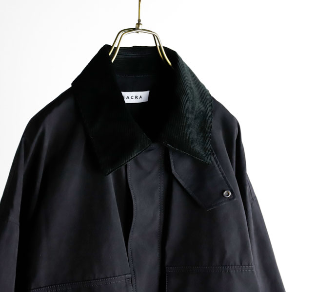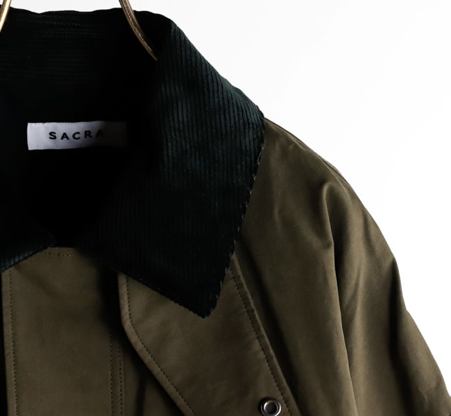 樹脂加工を施した独特の風合いも魅力。衿には9ウェールコーデュロイ、裏地にはコットンネル、フロントファスナーには美しい光沢と滑らかな滑り心地のエクセラファスナーを採用し、細部までこだわりのある仕立てになっています。