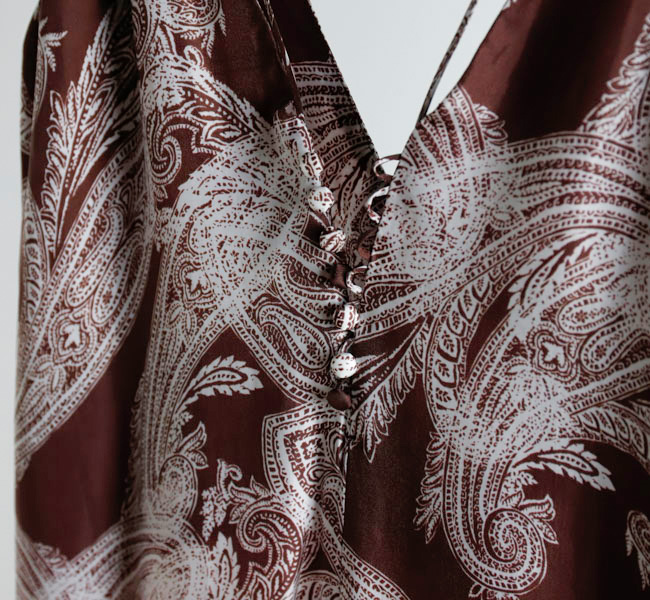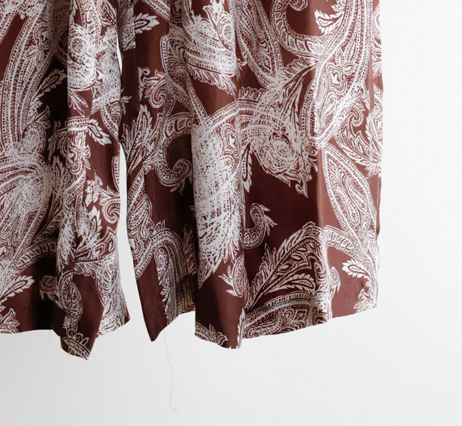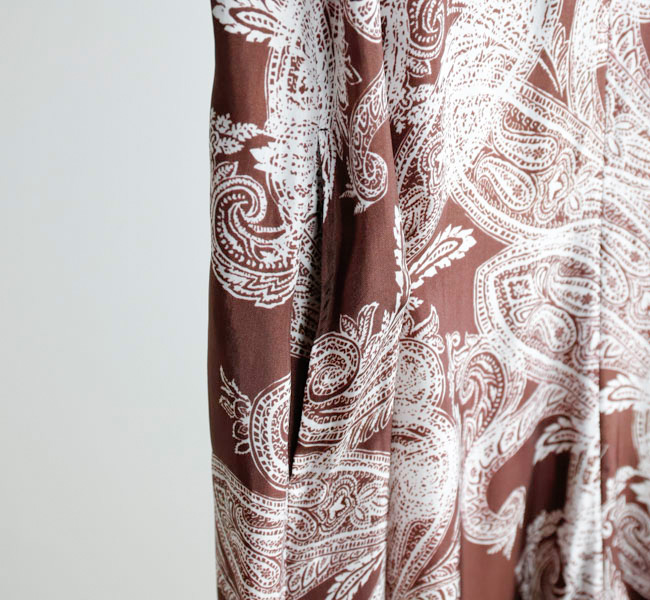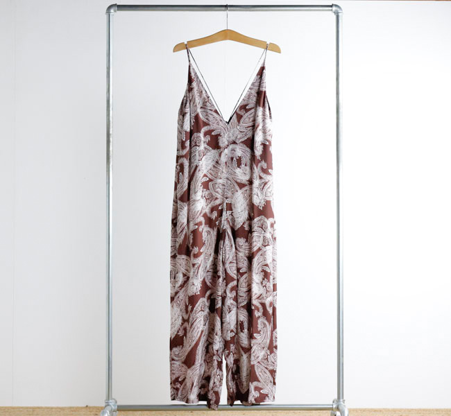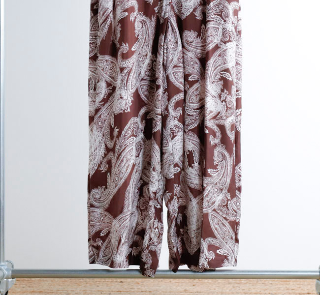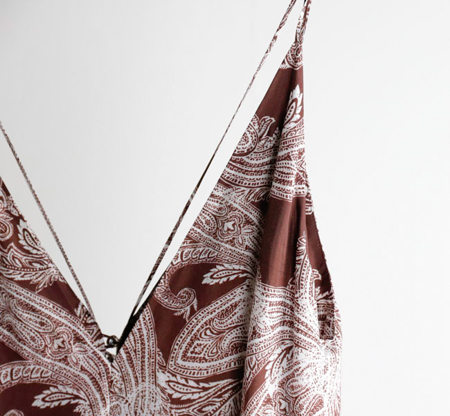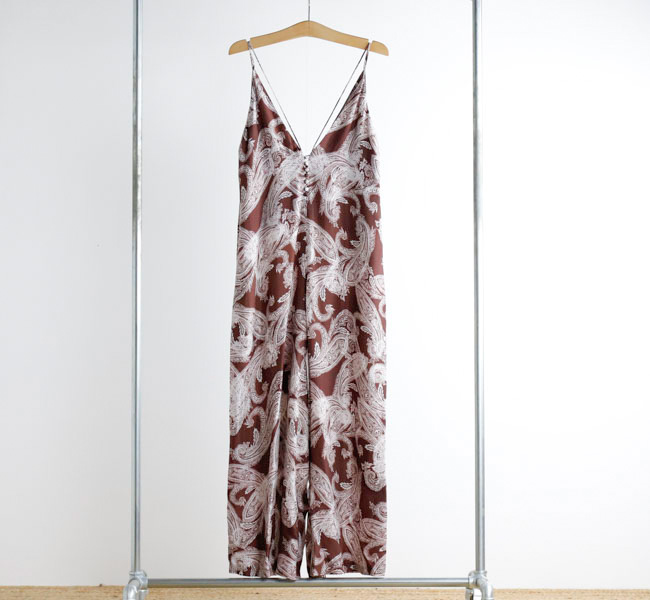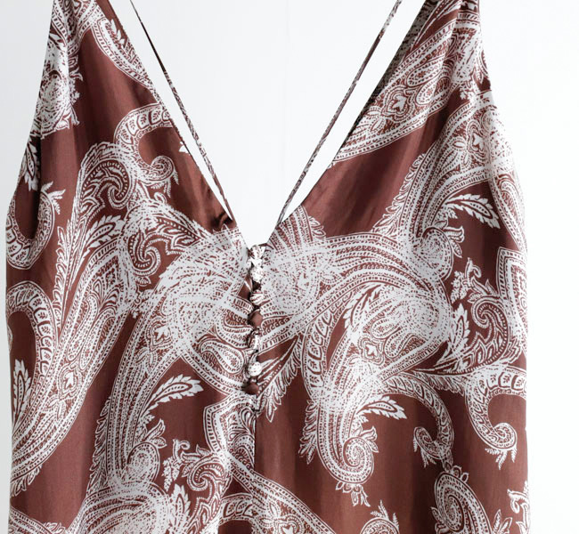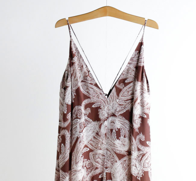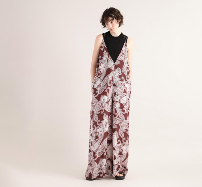 SACRAオリジナルのペイズリープリント。夏らしいテラコッタブラウンをベースに重なり合うホワイトペイズリー柄がモダンな印象です。シルキーな光沢感が特徴のキュプラレーヨンツイル素材がモダンな柄を引き立てます。華奢なストラップから裾にかけて広がるたっぷりの分量感が魅力のキャミサロペットは唯一無二のレイヤードスタイルが実現する存在感のある一着です。