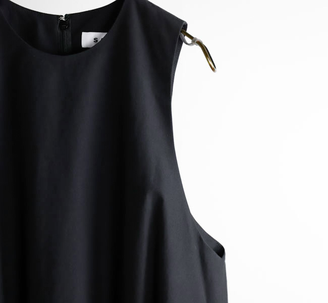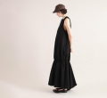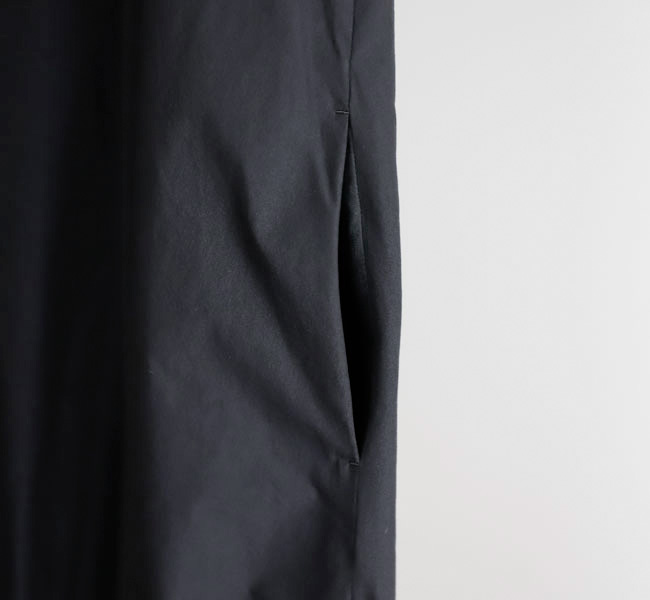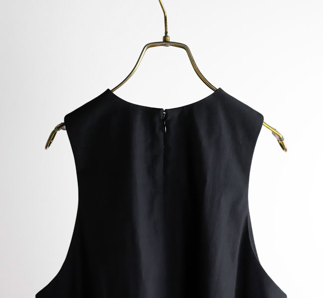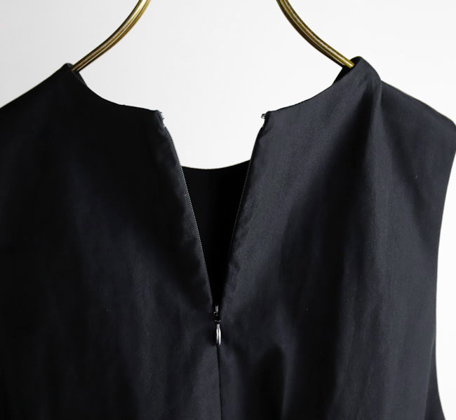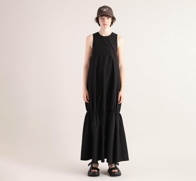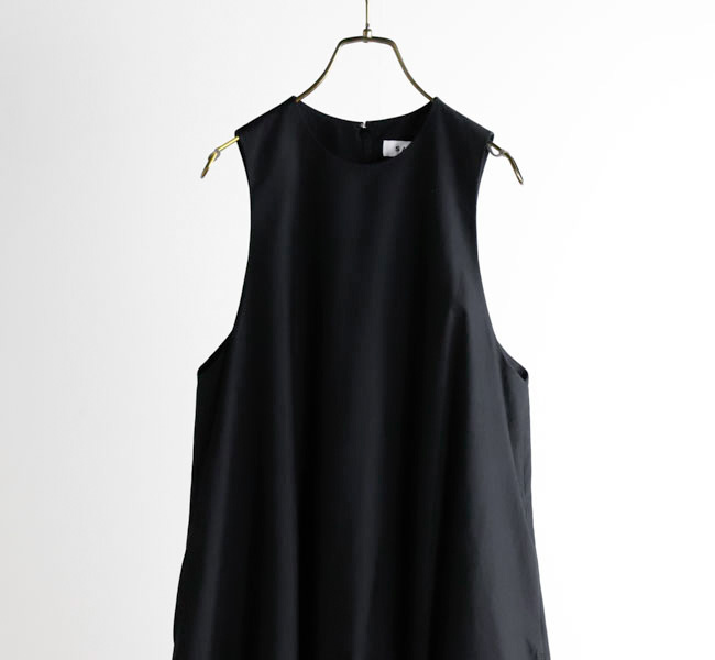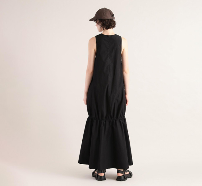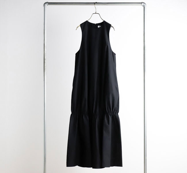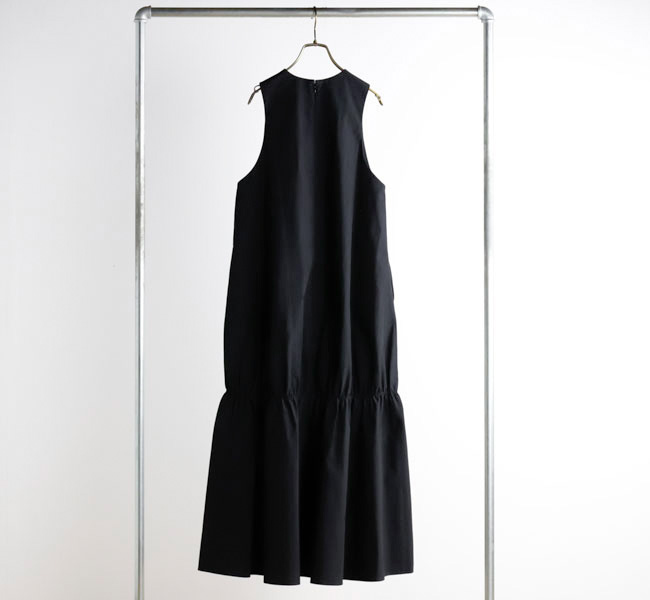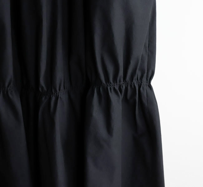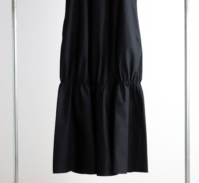 イタリアFAbRICA社の上質な高密度コットンナイロン素材を使用したワンピース。上質な素材をニドム加工で独特の風合いに仕上げた、雰囲気のある表情が特徴。デコルテを美しくみせるアメリカンスリーブとシャーリングで作り上げた膨らみのあるティアードデザインがポイントです。素材感を活かしたミニマルなデザインに、すっきりとした胸元から裾に向かって広がる丸みのあるシルエットが存在感際立つサマーブラックドレスです。