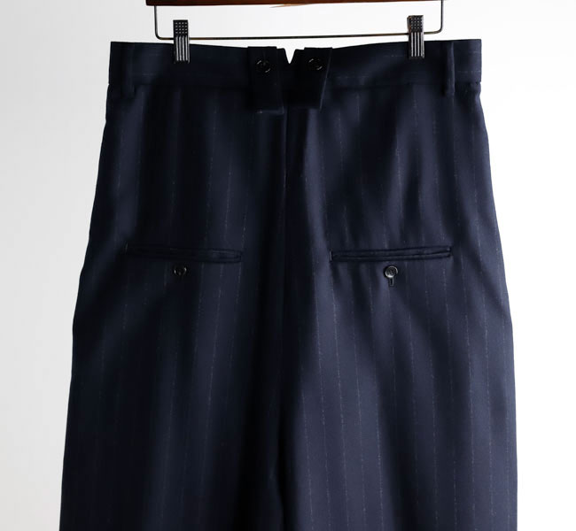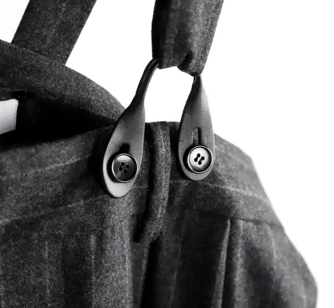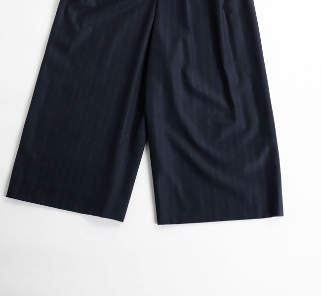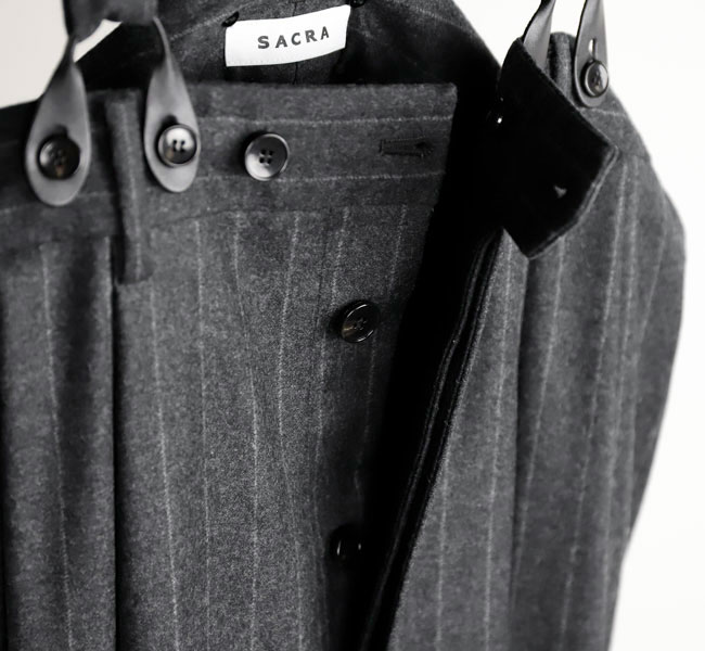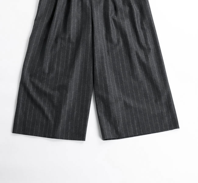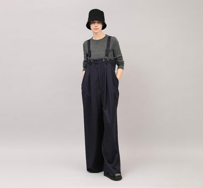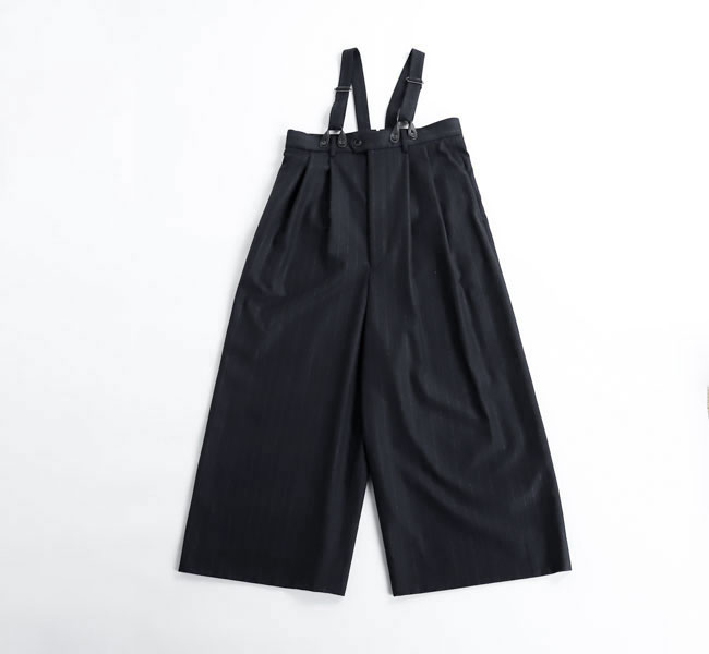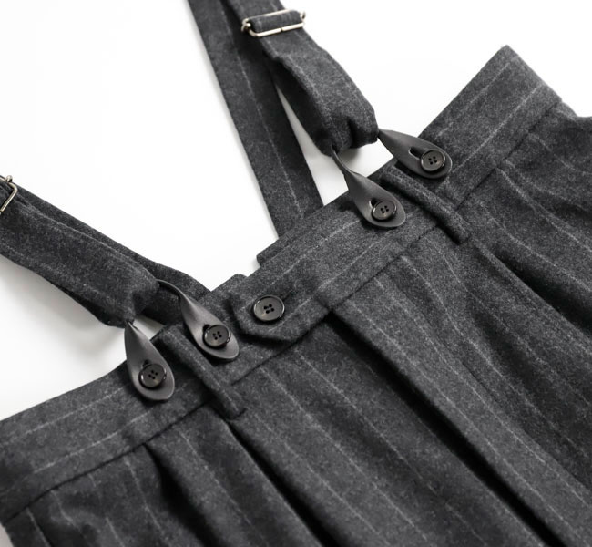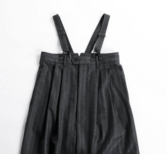 上質なカシミヤ混フラノストライプを使用したサスペンダーサロペット。高密度に織りあげられたフラノは程よいハリ感があり、ワイドシルエットを美しく保ちます。フロントのレザーパーツには牛革を用い、クラス感のある仕立てに。ストラップは前後で長さ調整が可能になっています。マニッシュな雰囲気とモード感のある存在感大の一着です。