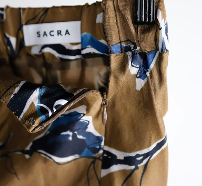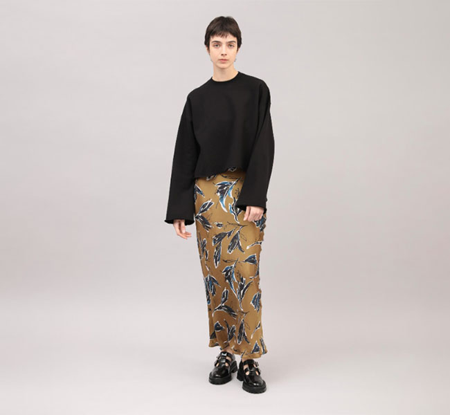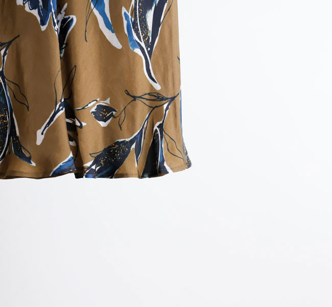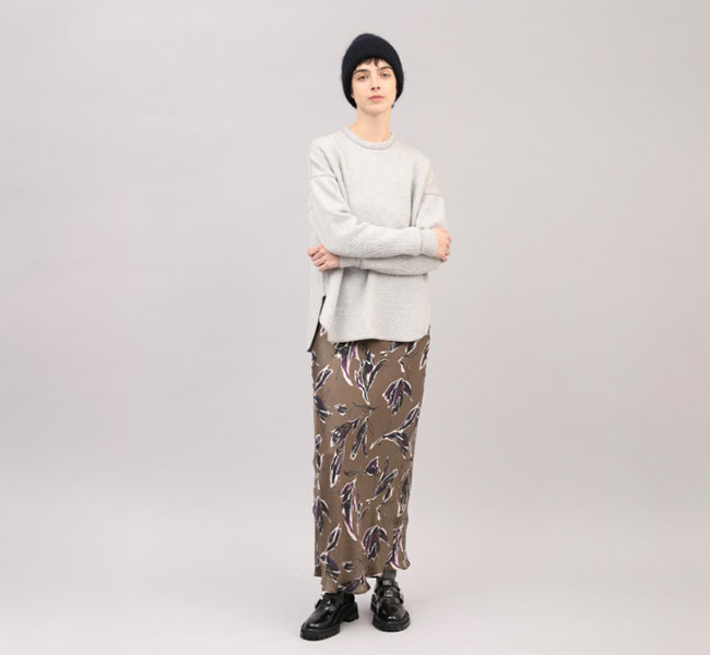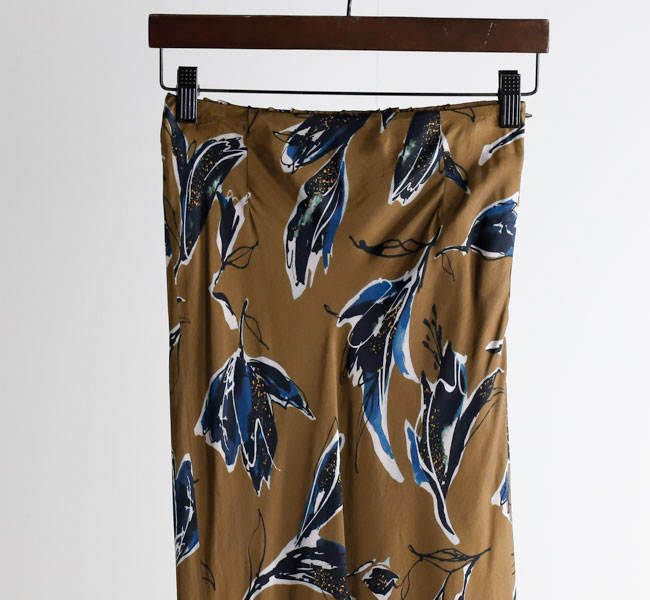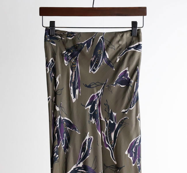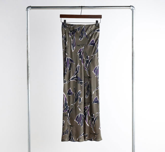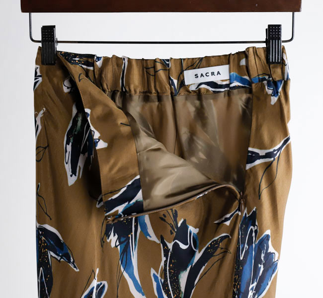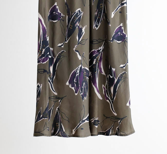 秋を感じさせる深みのある色合いが魅力のSACRAオリジナルプリントのナローラインスカート。ドローイングタッチと水彩タッチが重なり合ったモダンなフラワー柄が存在感を主張。光沢感とドレープ性が特徴のキュプラレーヨン素材がシックな雰囲気を引き立てます。バイヤス裁ちで仕立てたスカートは、スッキリとしたナローラインで、ボリュームトップスとの相性も良く、スタイリング映えする特別な一着です。
