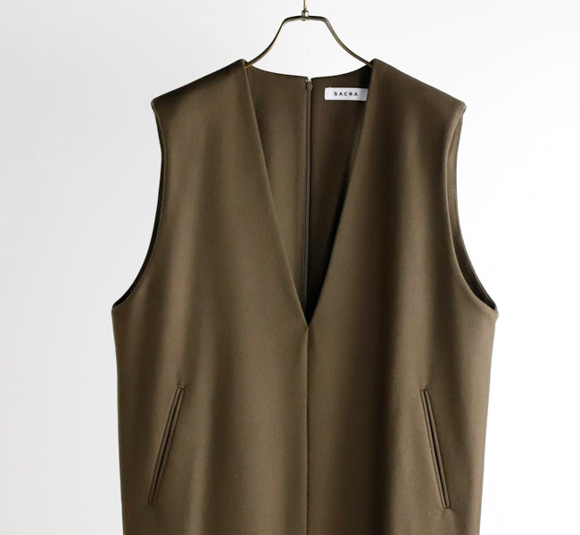 深いVネックと肩パッド内蔵の程よいビッグショルダーデザインがポイント。