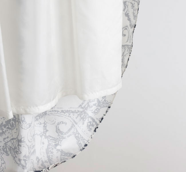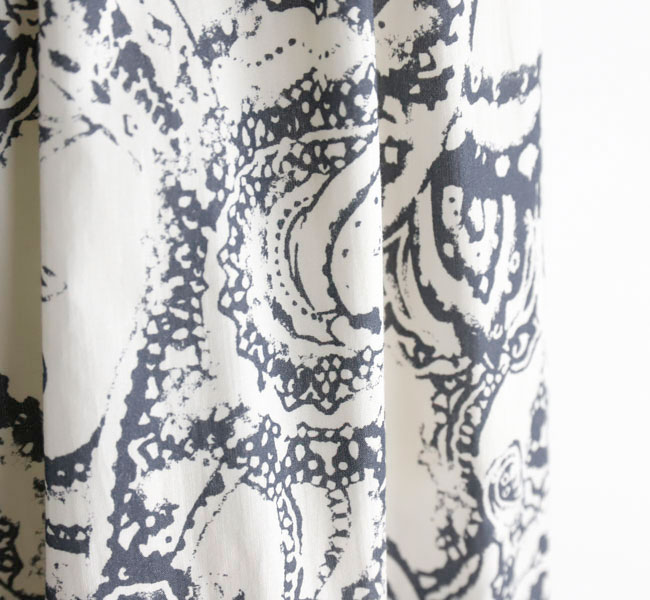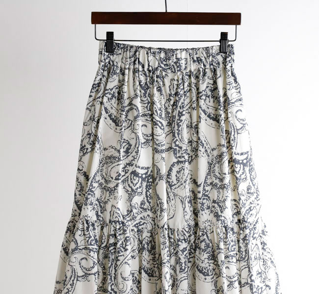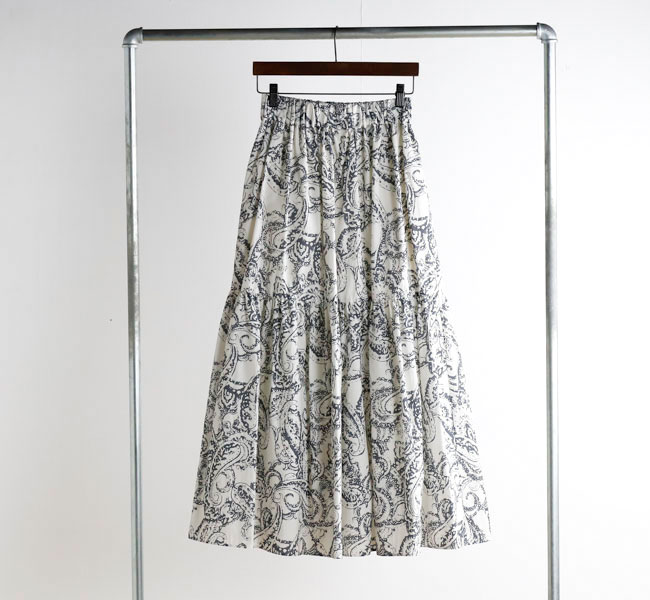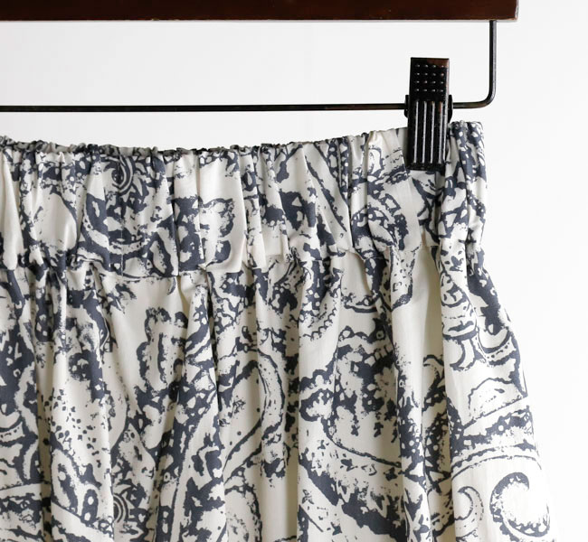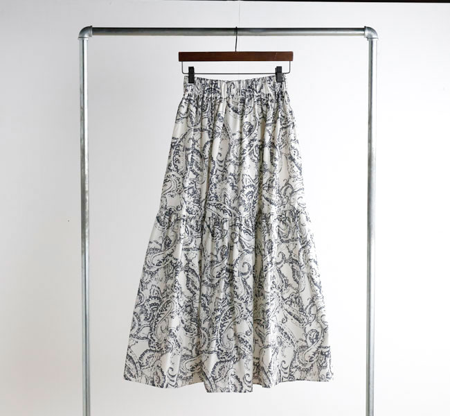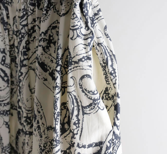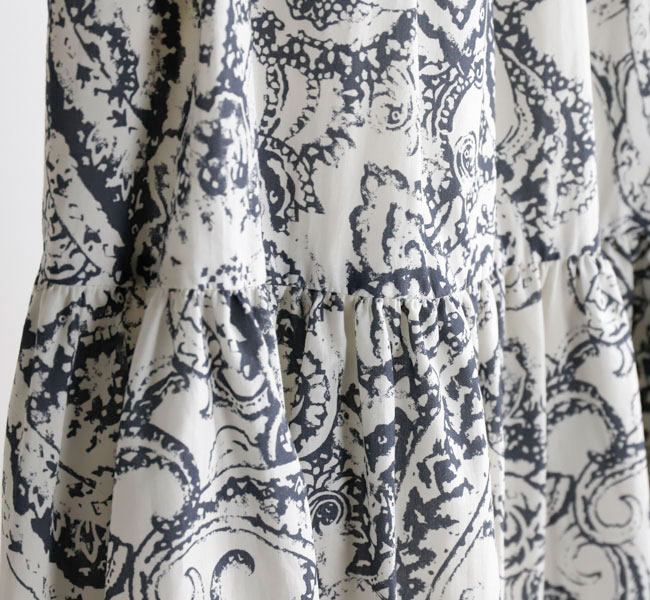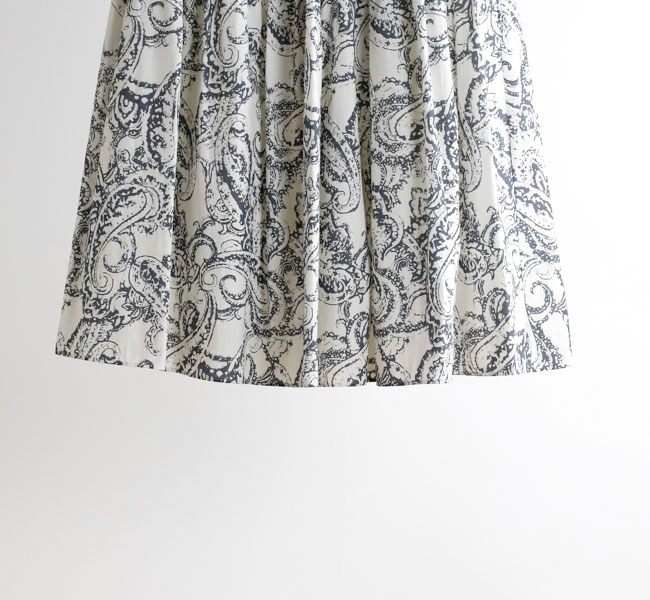 独特のタッチで描かれたペイズリープリントはモノトーンカラーでシックな印象に。柔らかさと雰囲気のある表情を持つコットンローン素材にのせて軽やかさを演出。