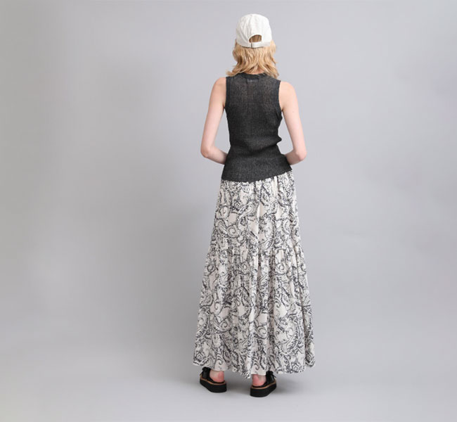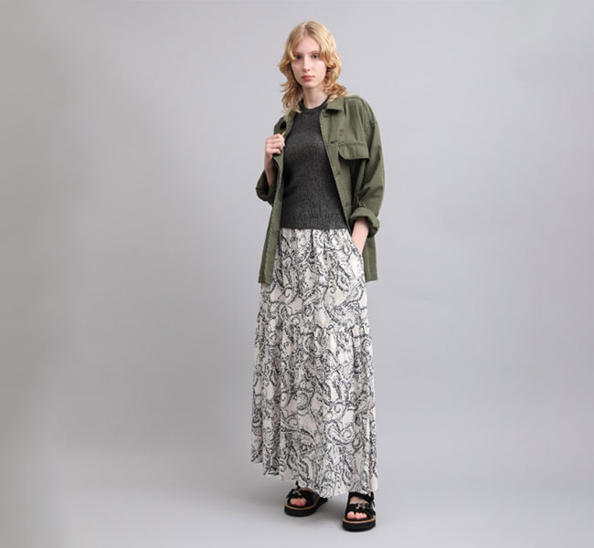マキシ丈の甘さを抑えたティアードスカートは、スタイリングの主役になる一着です。