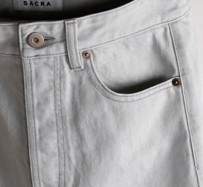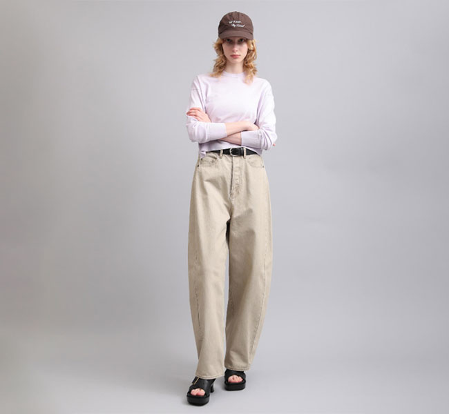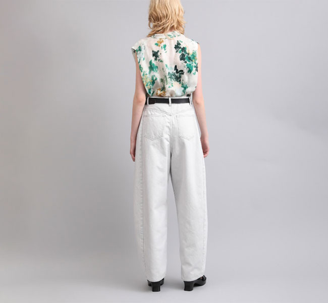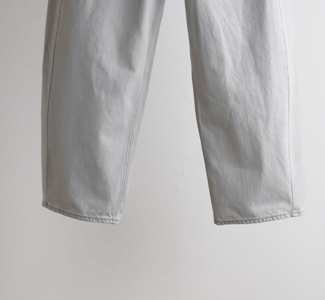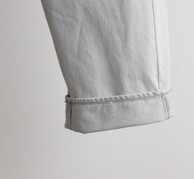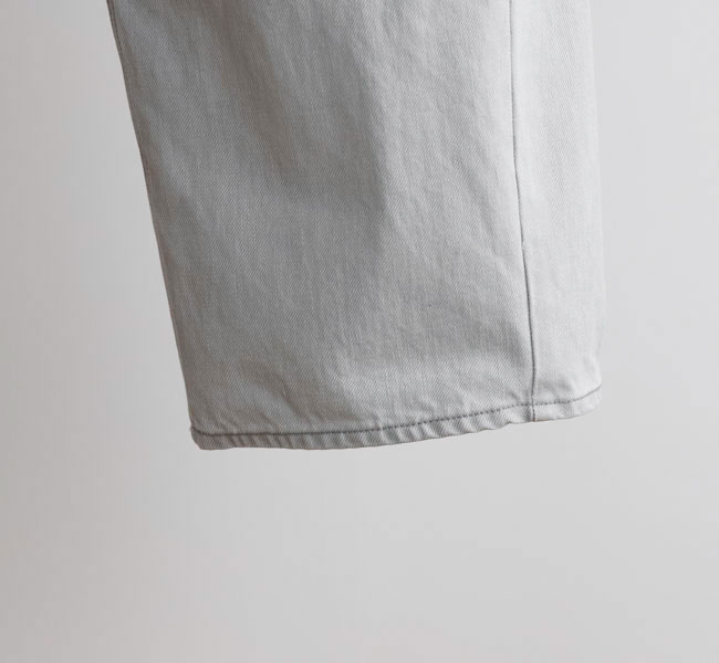 特殊な表面染着によるムラ染めのデニムに独自の加工を施し、洗いざらしたようなナチュラルな表情と独特の淡い色合いが実現。三面体で作り上げた特徴的なカービーシルエットがポイント。新鮮な色合いが印象的なシーズンムード溢れる一着です。