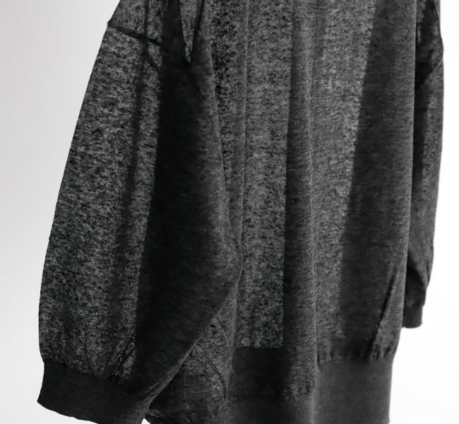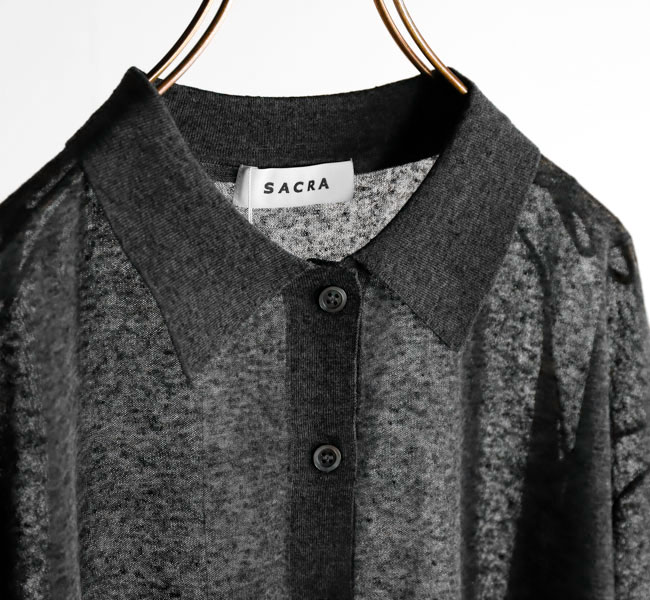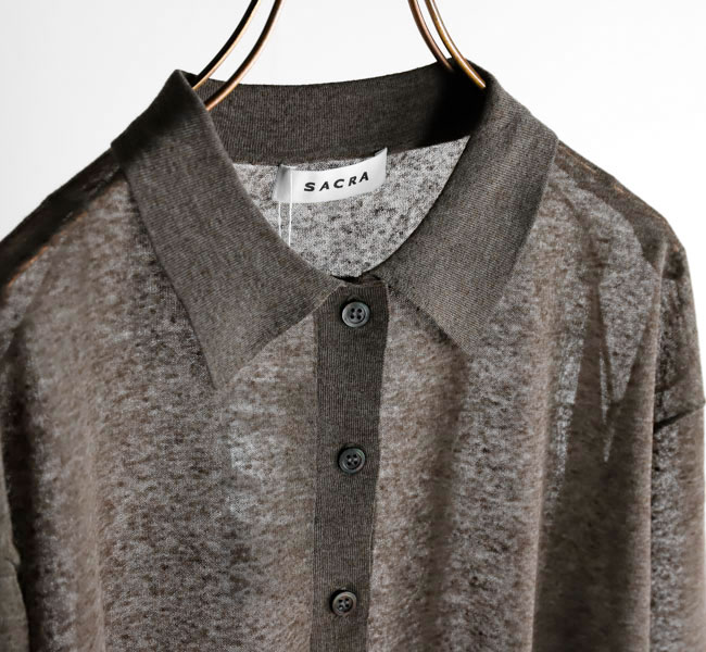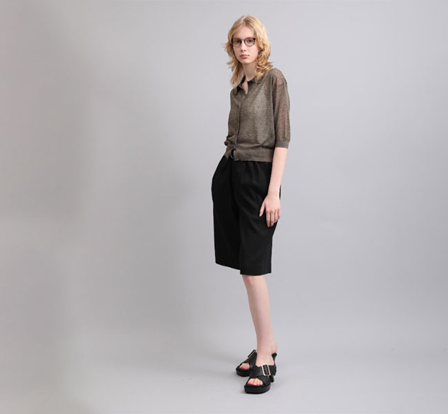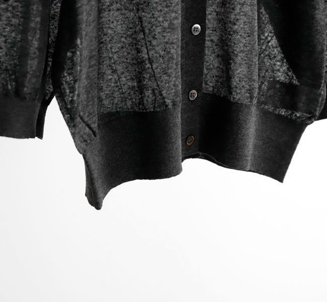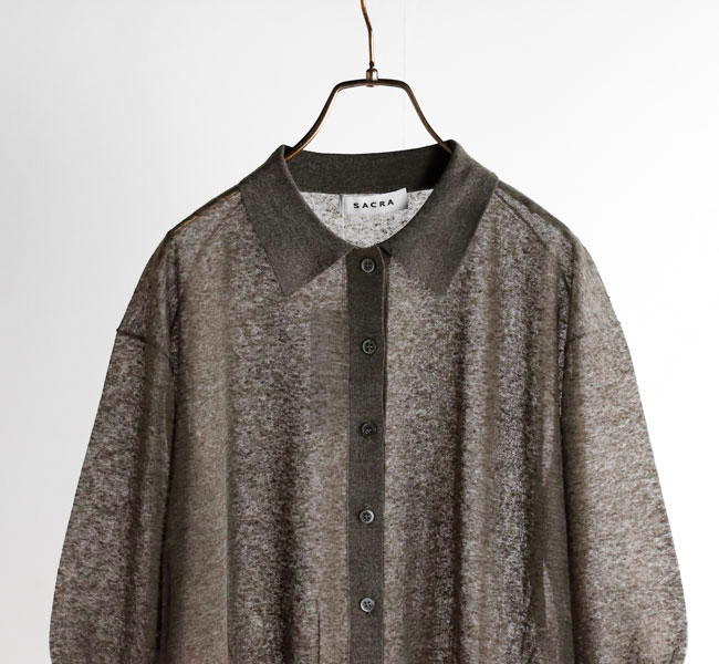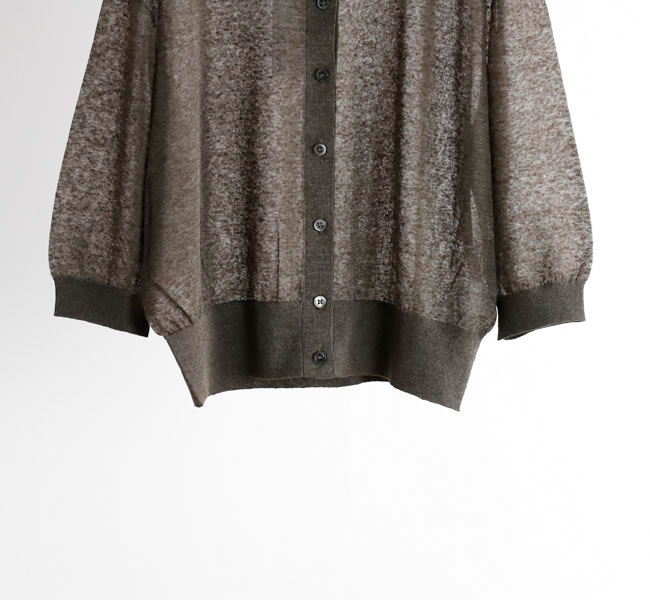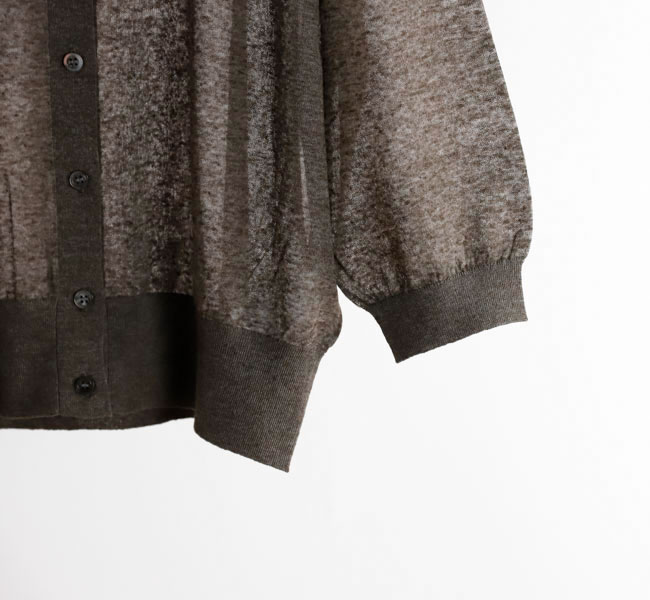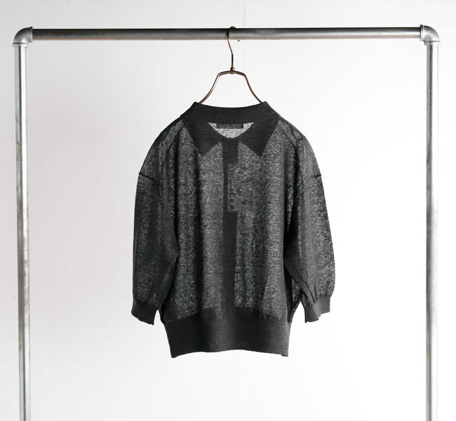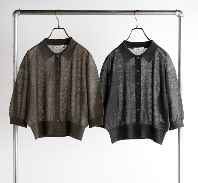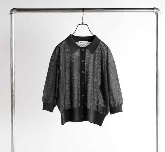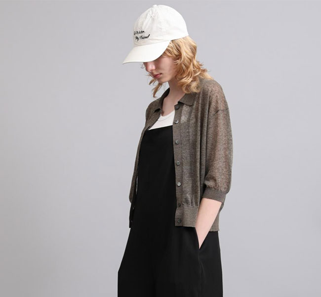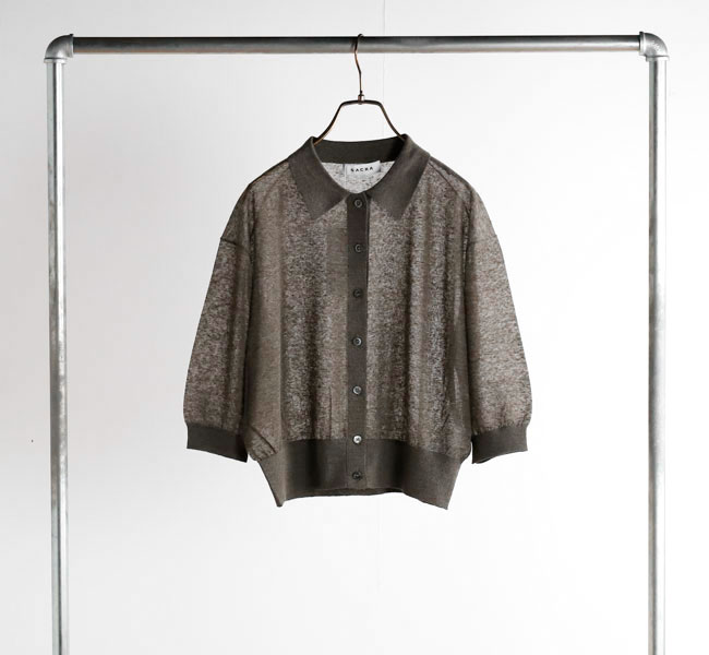 リネンと合繊の混紡糸を使用したポロカーディガン。独特のメランジ感のある表情と程よいシアー感が魅力。クロップド丈とハーフスリーブの絶妙なバランスがシーズンムード高まる一着です。羽織りとしてはもちろん、前を留めてプルオーバーとしての着こなしもおすすめです。