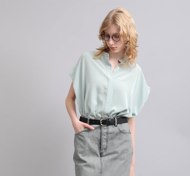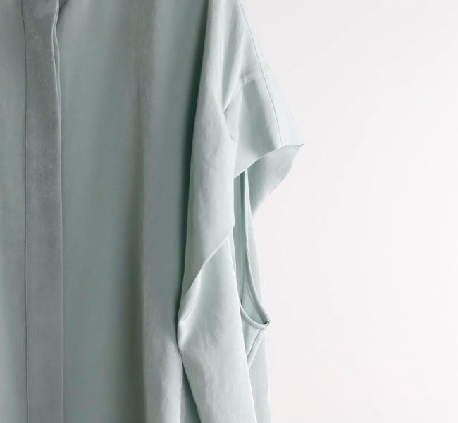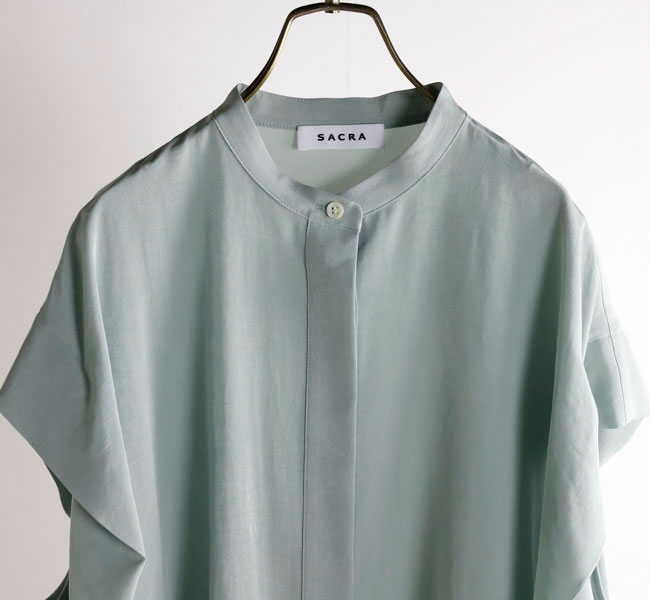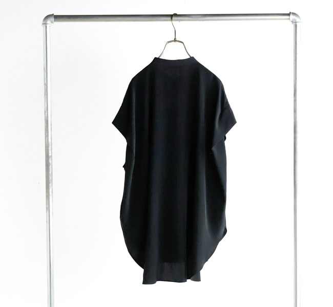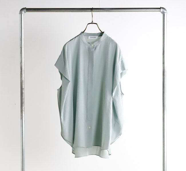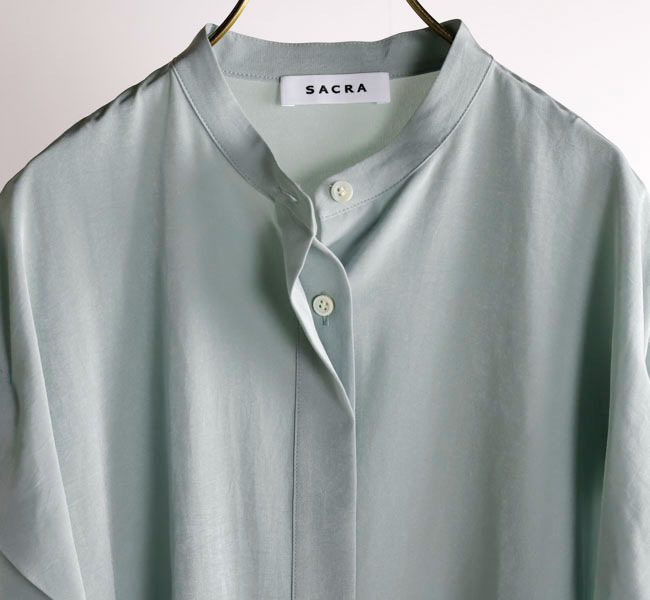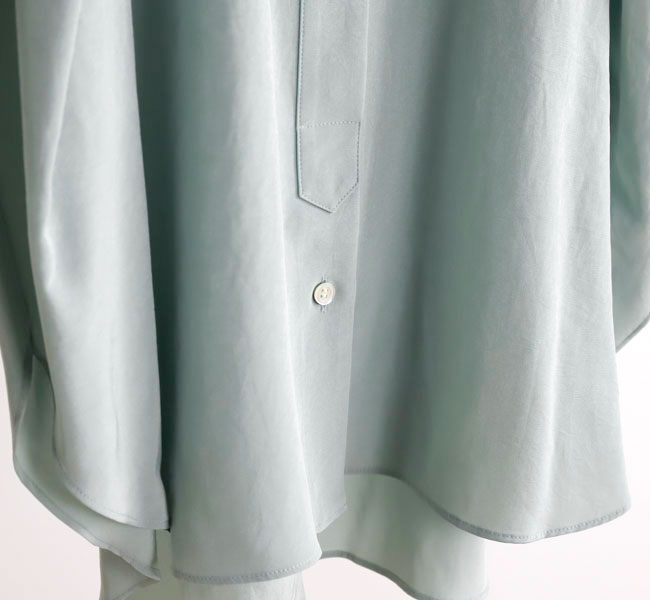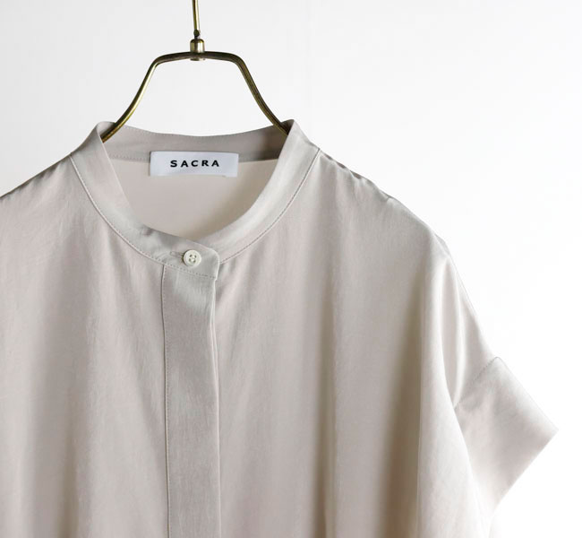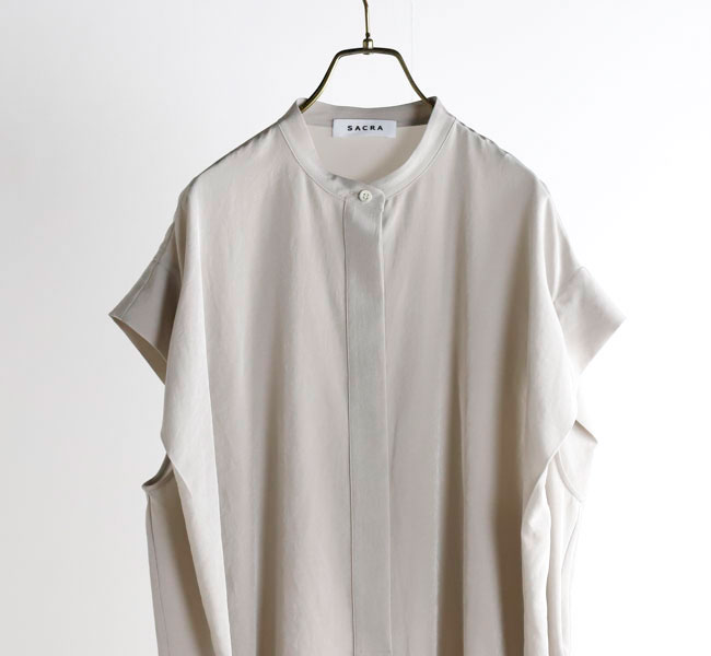 柔らかな風合いとシルクのような肌触りが特徴の素材を使用したバンドカラートップ。