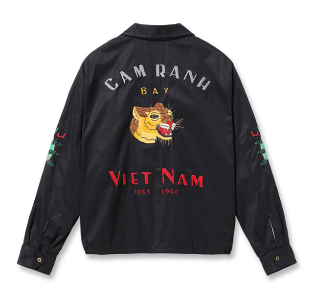 戦後の日本で誕生したスカジャン同様、1960年代から1970年代のベトナム戦争時に生まれたスーベニアジャケットが、通称ベトジャン。コットンツイル、もしくはカモフラージュ柄のポンチョライナーの2種類の生地が主に使われ、マットな太めの色糸で絵柄が刺繍されている。