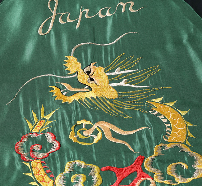 リバーシブル面は、身頃より袖下の色の方が濃い「逆配色」。グリーン×ブラックのダークトーンのボディには、金龍に使われているイエローや淡いピンクの色糸が映える。