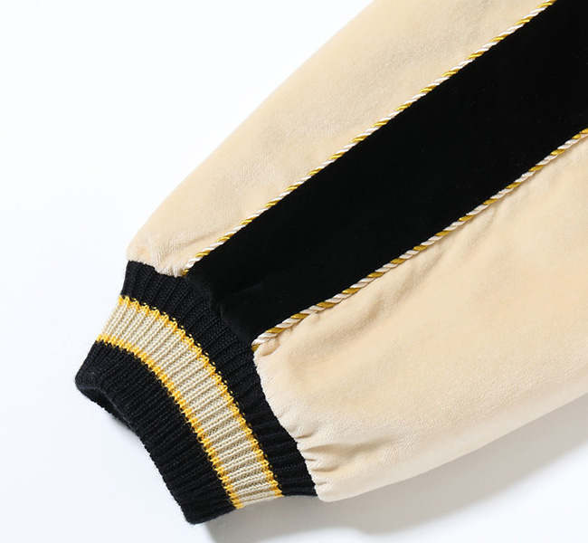 サテンのスカジャンと同じように身頃と袖下の色を切り替えているが、仕上がりは全くの別物であり、ただならぬ存在感を醸し出している。刺繍は1950年代中期の作品をもとに、虎の顔を細部まで緻密に表現した「タイガーヘッド」と呼ばれる人気の絵柄。頬の毛や鬣は針足を何度も変えながら一本一本繊細に描かれており、優れた職人の手掛けた刺繍であることがわかる。