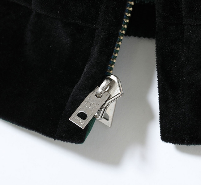 2色の別珍生地を使い、身頃と袖下で2トーンに切り替えたスーベニアジャケット。ヴィンテージにも実在するが、世界でまだ数着しか確認されていない希少なモデル。通常の別珍と異なり、現存する個体はどれも中綿無し。リバーシブル面はサテン生地だがキルティングステッチは入らない仕様である。