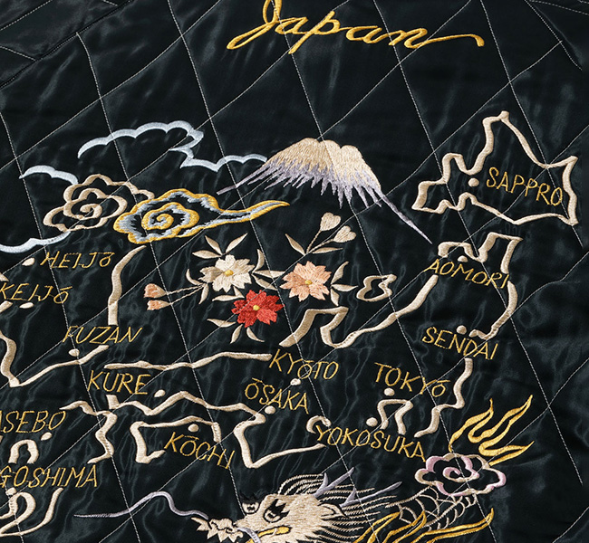 スーベニアジャケット(スカジャン)とは戦後間もない頃、米兵が日本駐留の記念としてオリエンタルな柄(鷲・虎・龍)や所属していた部隊、基地名などを自分たちのジャケットに刺繍したのが始まりである。それらは土産物として商品化され、各地のPX(Post Exchangeの略で米軍基地内の売店の通称)で販売されるようになった。当時、このスーベニアジャケットをはじめとした衣料品を米軍基地へ納入していたのが、テーラー東洋(東洋エンタープライズ)の前身の会社「港商商会」であり、スーベニアジャケットの生産が全盛期となった1950年代には納入シェアの95パーセントを占めるほどであった。港商から始まり半世紀以上スーベニアジャケットを作り続けてきたTAILOR TOYO(テーラー東洋)。一過性のブームではなく、スカジャンを文化として継承し続けているこのブランドこそが、スカジャンのオリジナルである。