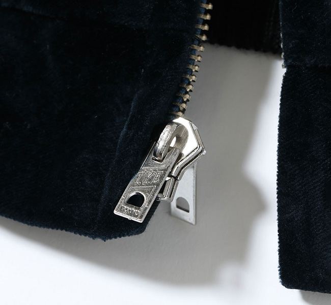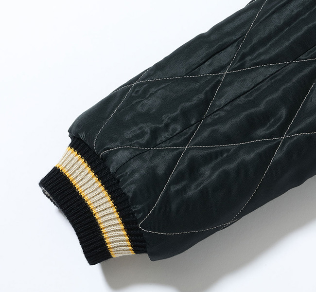初期のスーベニアジャケットはアセテート生地のリバーシブル仕様が多いが、当時のバリエーションとして毛羽感のある別珍(べっちん)生地を使ったモデルも存在する。中綿を入れることで防寒性を高め、リバーシブル面のアセテートには中綿を押さえるためのキルティングが施されていた。