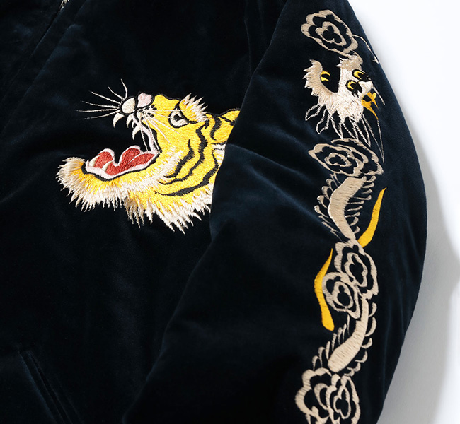 取扱い開始したテーラー東洋。岩場に鎮座する虎を描いた作品。マットなダークネイビーの別珍生地に光沢感のあるレーヨン糸のイエローが際立っている。程よくデフォルメされた虎の刺繍は他のヴィンテージスカジャンの刺繍に比べて一回り大きく、インパクトある仕上がり。特徴的な書体の「JAPAN」の文字や、通常より縦に長い袖の昇龍もポイント。