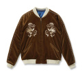 取扱い開始したテーラー東洋。ヴィンテージでも珍しいブラウンの別珍生地で仕立てられた一着。雲間から見え隠れするほど長い体躯を持つ白龍の絵柄は、1950 年代中期のヴィンテージを再現したもの。鬣をなびかせて大空を舞う龍を白を基調とした色糸で立体的に刺繍し、縁取りのイエローや舌のレッドなど部分的に別の色を使うことでインパクトを持たせている。