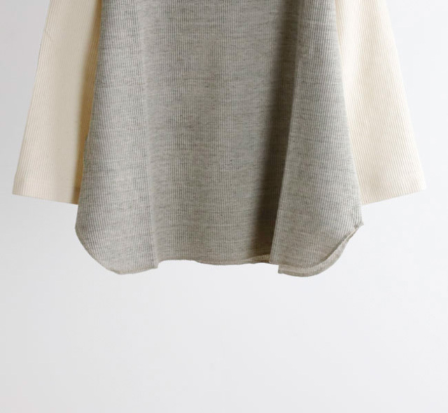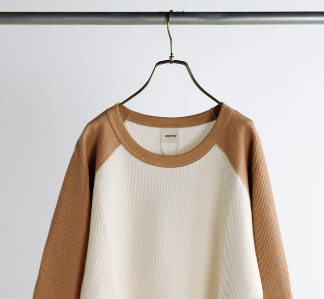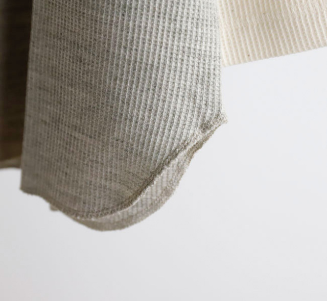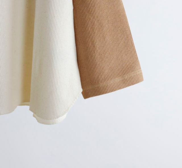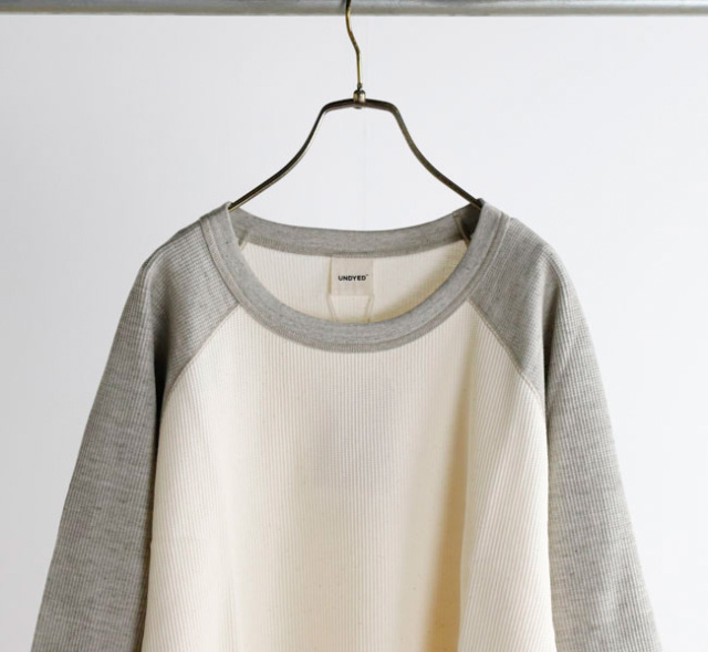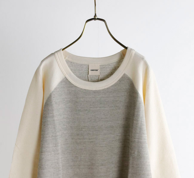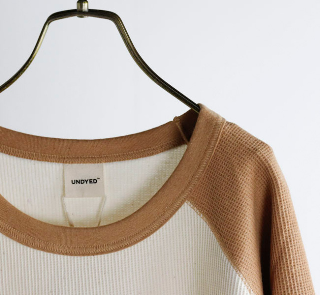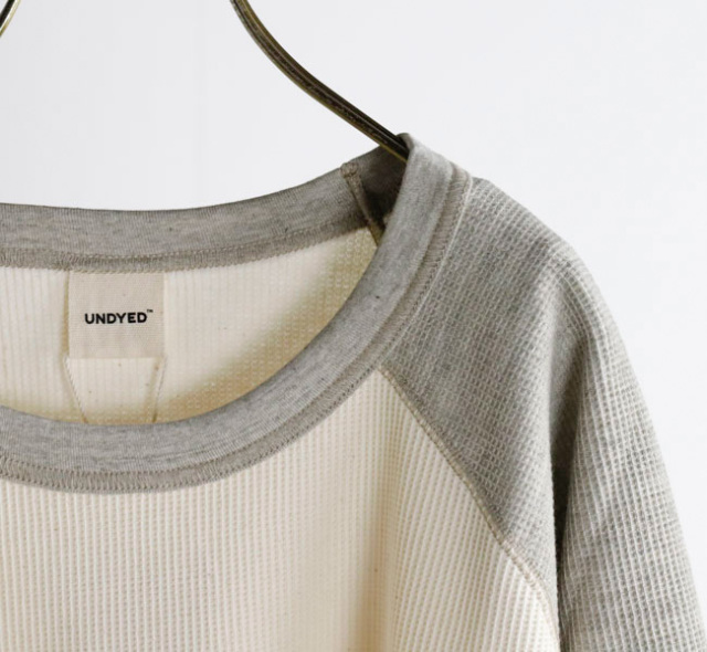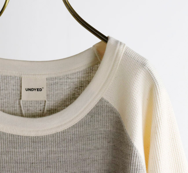 UNDYEDでは無染色(漂白→染色→柔軟をしない)で、原料本来の色をそのまま活用する事にこだわっています。 自然の柔らかの色合いはもちろん、染色加工を一切行っていない事で、生地本来の柔らかさも失わず素肌で着ても心地良い肌触りの生地に仕上がっています。 比較的薄手のワッフル素材なのでロンT感覚でご着用いただけます。