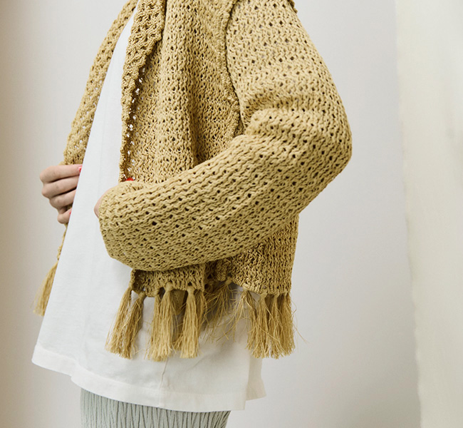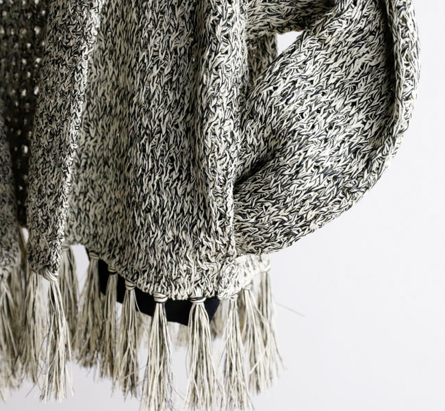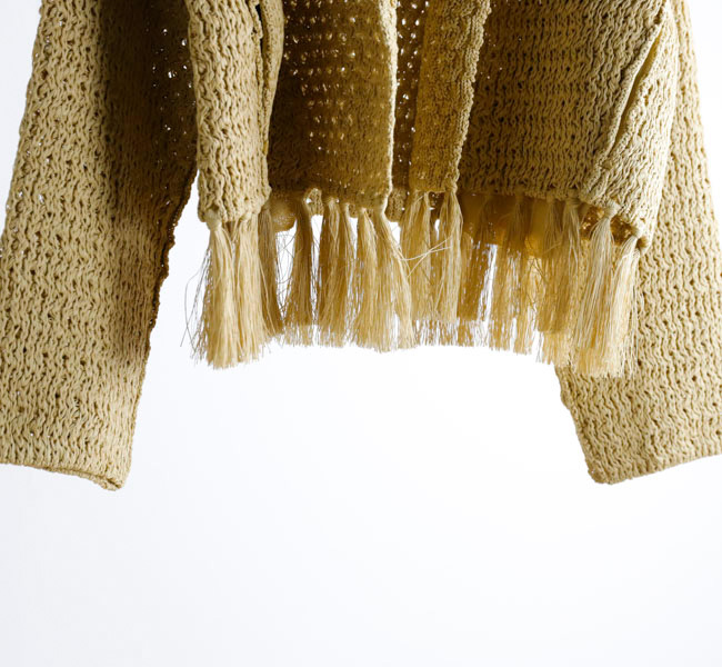 裾に手作業で作ったフリンジをつけてインパクトのあるデザインになっています。