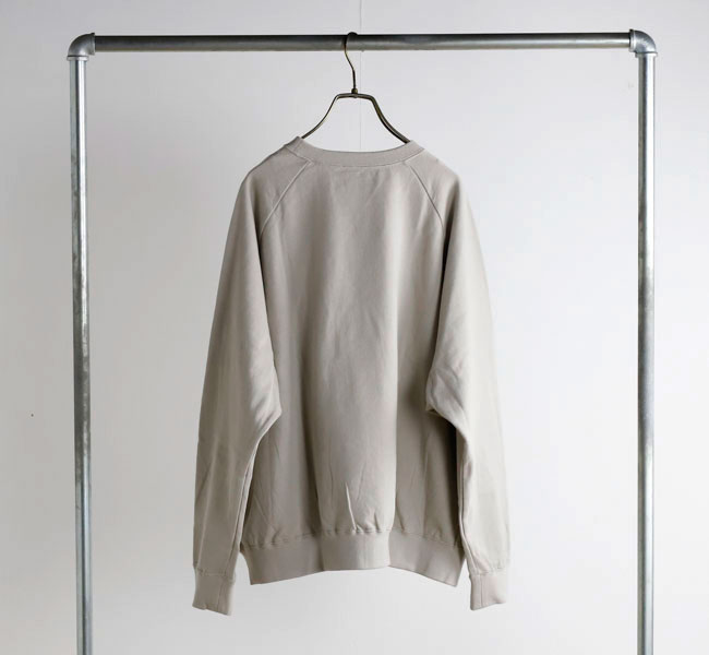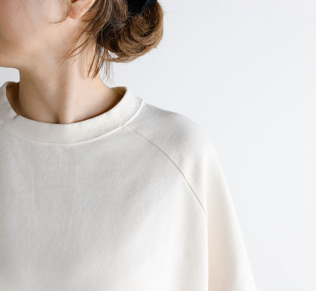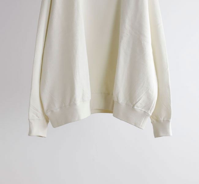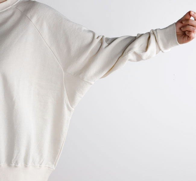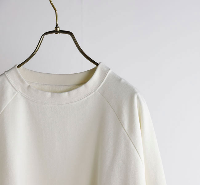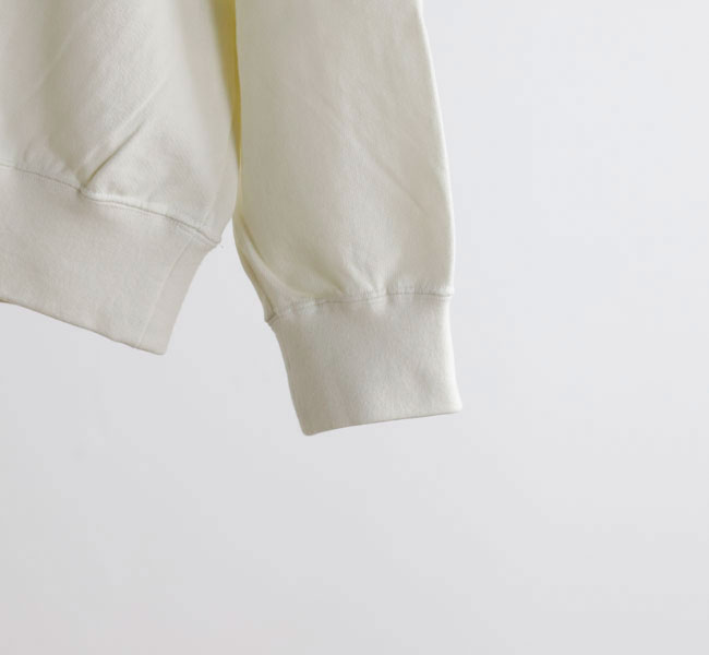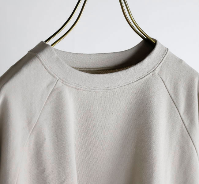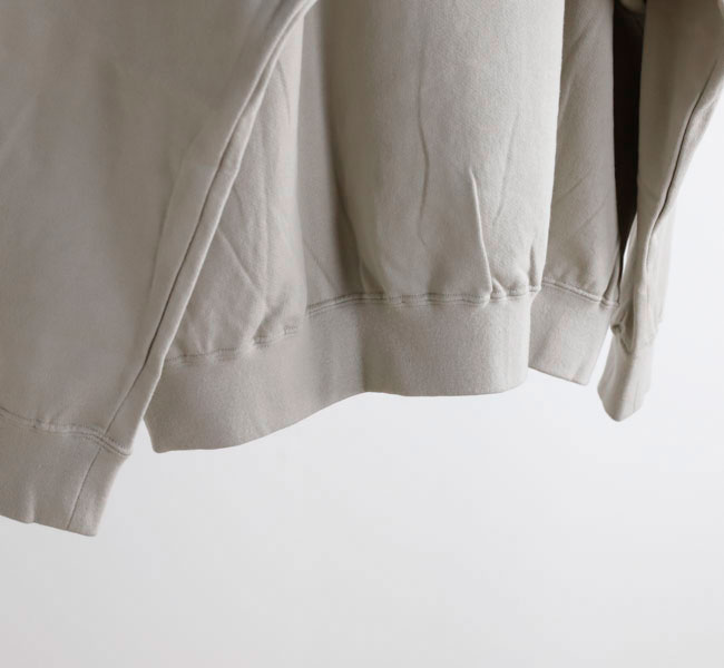 オーガニックコットンの空紡糸を使用してお作りしたスウェットです。トルコ・エーゲ海イズミール地方で栽培される長綿のオーガニックコットンで、コットンは一般的に繊維長が長いほど高級とされ、しなやかで上質な糸をつむぐことができます。生地表面に傷を入れたような仕上げを施しております。裏毛はパイル状に編みこまれており、タオル生地のようにループさせている為、保温性に優れている上、吸水性もあります。