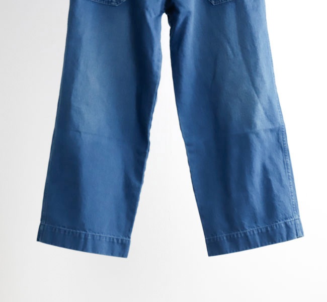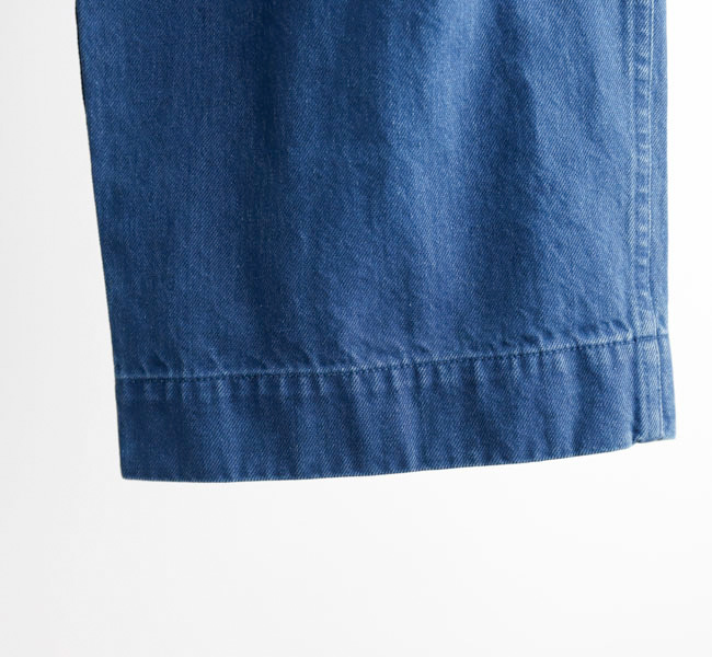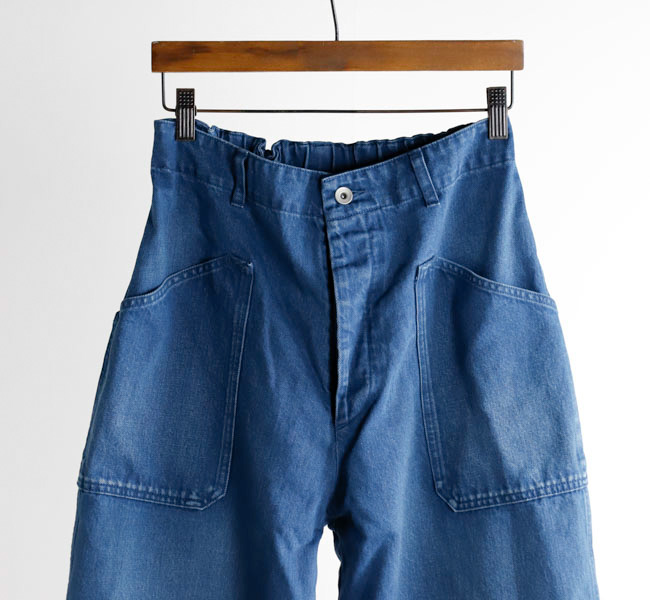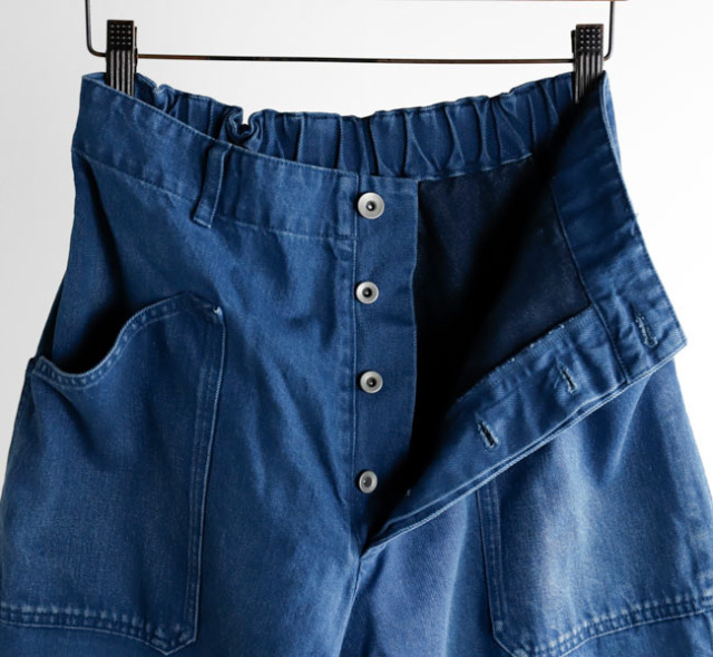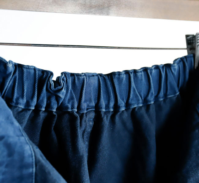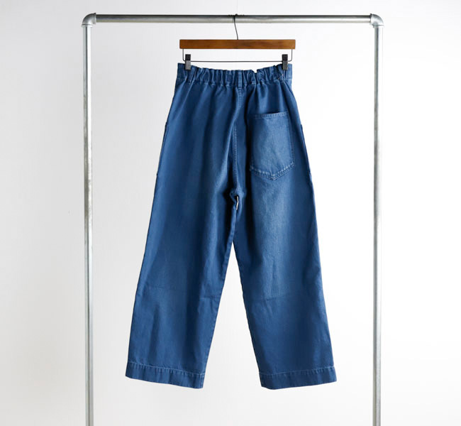 裾に向かって真っすぐに落ちるストレートシルエット。フロントはボタンフライになっています。ウエストは後ろにのみゴムの入ったイージースタイル。
