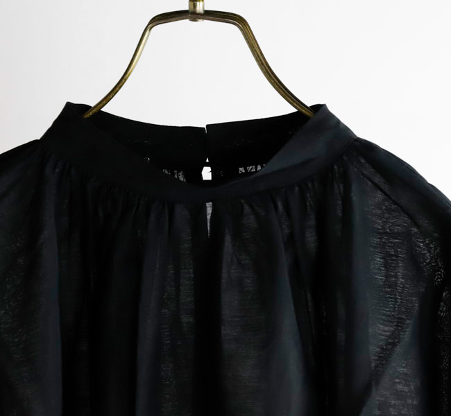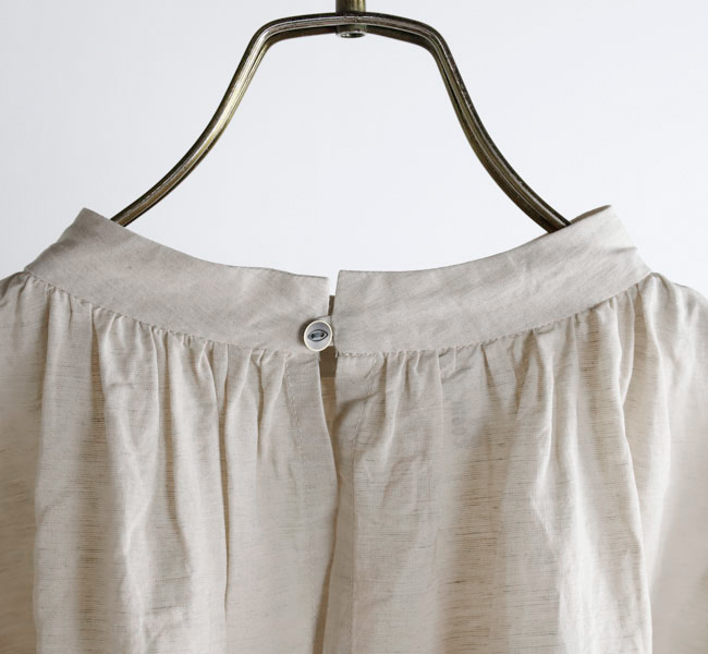 衿ぐりや袖口にたっぷりとギャザーを入れ、ふんわりと広がるAラインシルエットに仕上げてあります。