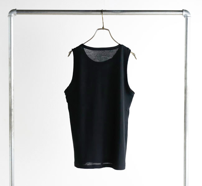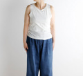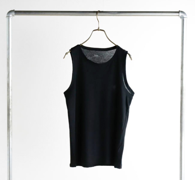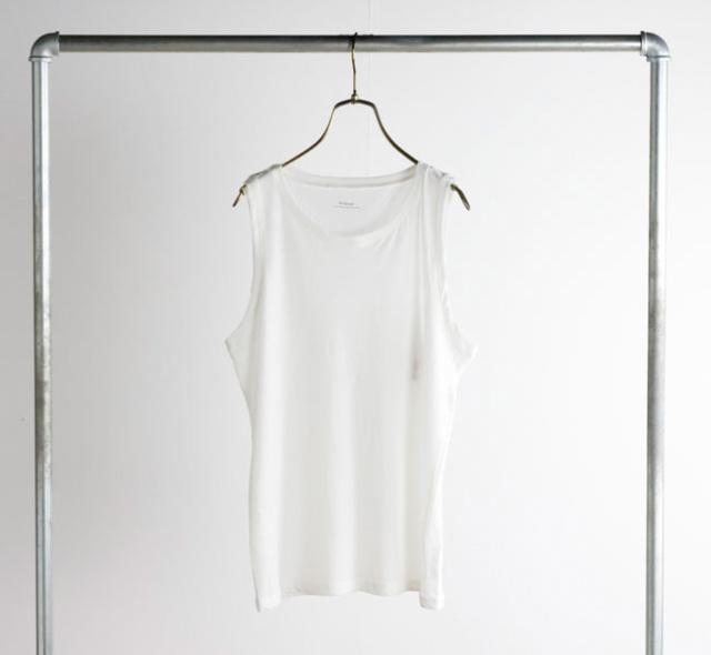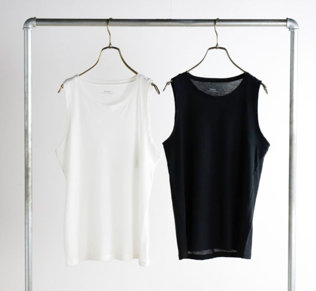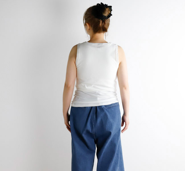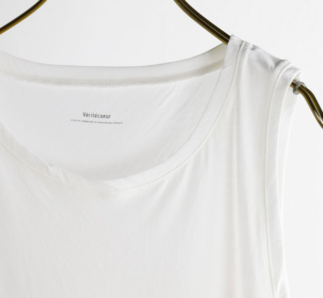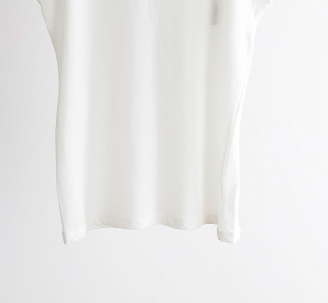 透け感のある女性らしいインナーです。衿ぐりにはリブではなく共布を使用し、丁寧なインターロック始末を施し、製品を洗い立てて表情のある1枚に仕上がってます。