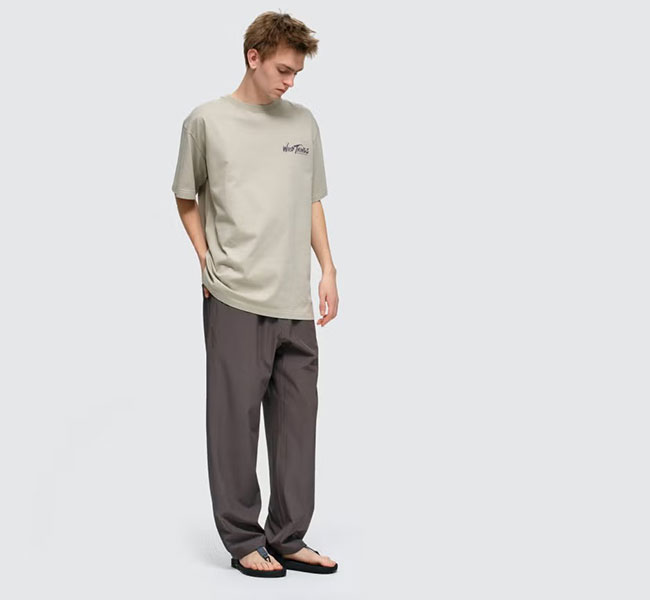薄手でとろみのある質感が特徴で、柔らかなドレープ感と高い伸縮性により、ストレスフリーな穿き心地。日差しの強い屋外でも肌を保護する機能を備えている。 デザインのアクセントとして、左腿にはミリタリータグをイメージしたプリントを配置。収納面では、左右の脇ポケットに加え、左右の後ろポケットを合わせた計4つを搭載し、実用性を高めている。 シワになりにくいイージーケアな特性も魅力。日常からアクティブなシーンまで、軽快に着用できる一着。