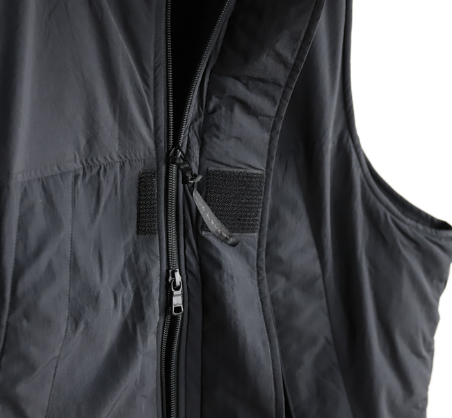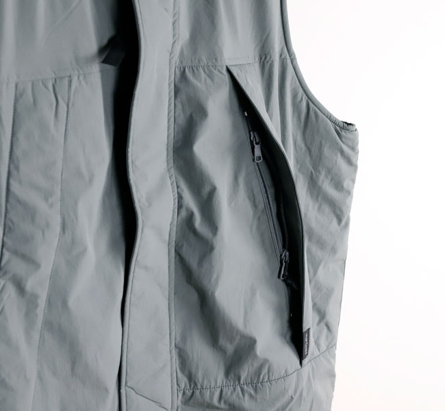 モンスターパーカーのポケットデザインを取り入れた中綿ベスト。 アウターの上からも着られるオーバーサイズの設定ながら中綿量を調整したことで 膨らみすぎないスッキリしたシルエット。 今期はXSサイズを追加しジャストサイズやレディースのニーズに対応。 モンスターパーカーと違いフードがないためパーカー等のインナーとも合わせやすい。 表地は耐久撥水ナイロン、中綿はクライマシールドコンバットを使用。